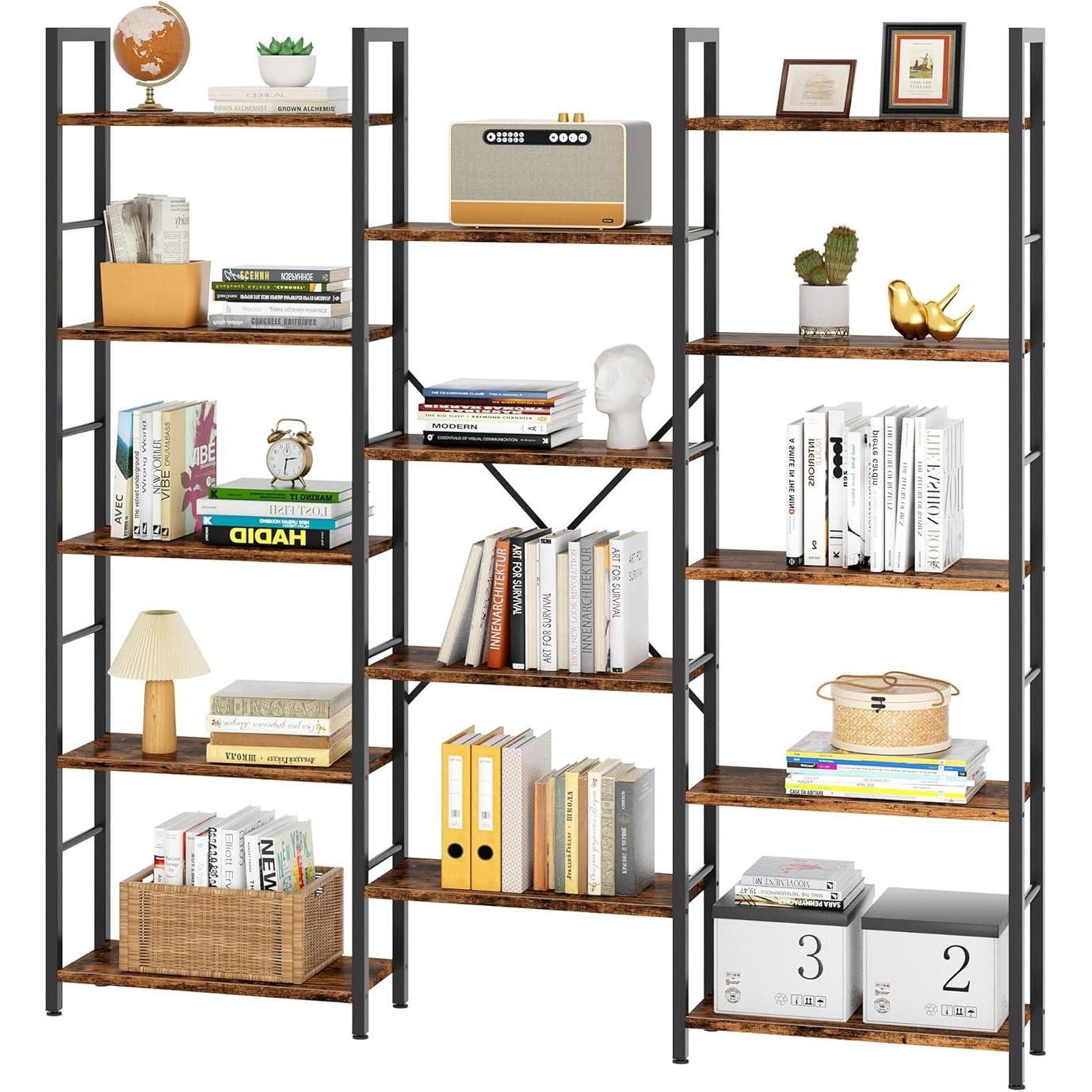 Triple Wide 5 Tier Bookshelf with 14 Open Display Shelves, Adjustable Shelves for Home Office, Living Room, Bedroom