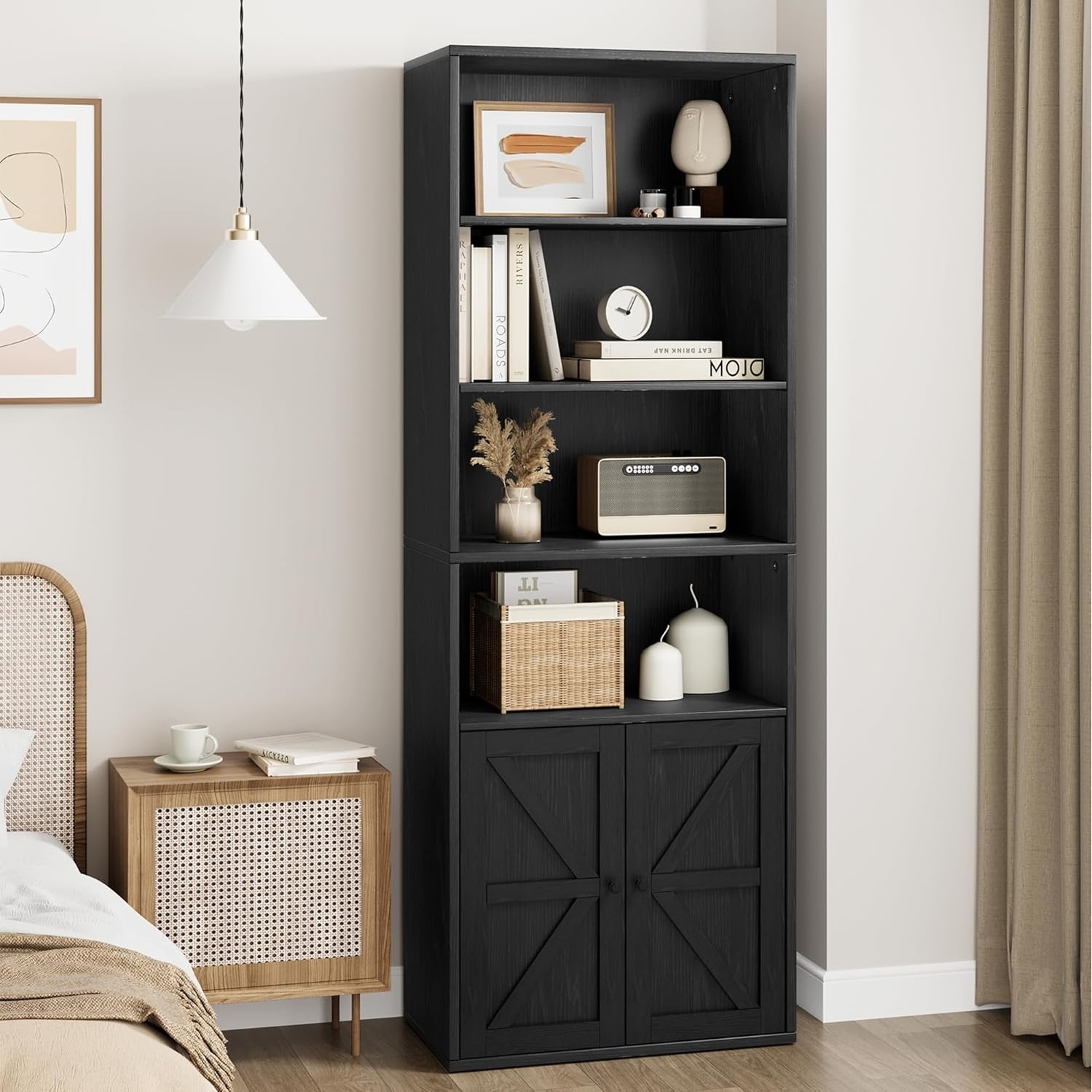 Farmhouse Bookshelf with Doors, 6-Shelf Wooden Display Storage, 71.4in Tall, Grey, for Bedroom, Living Room, Home Office