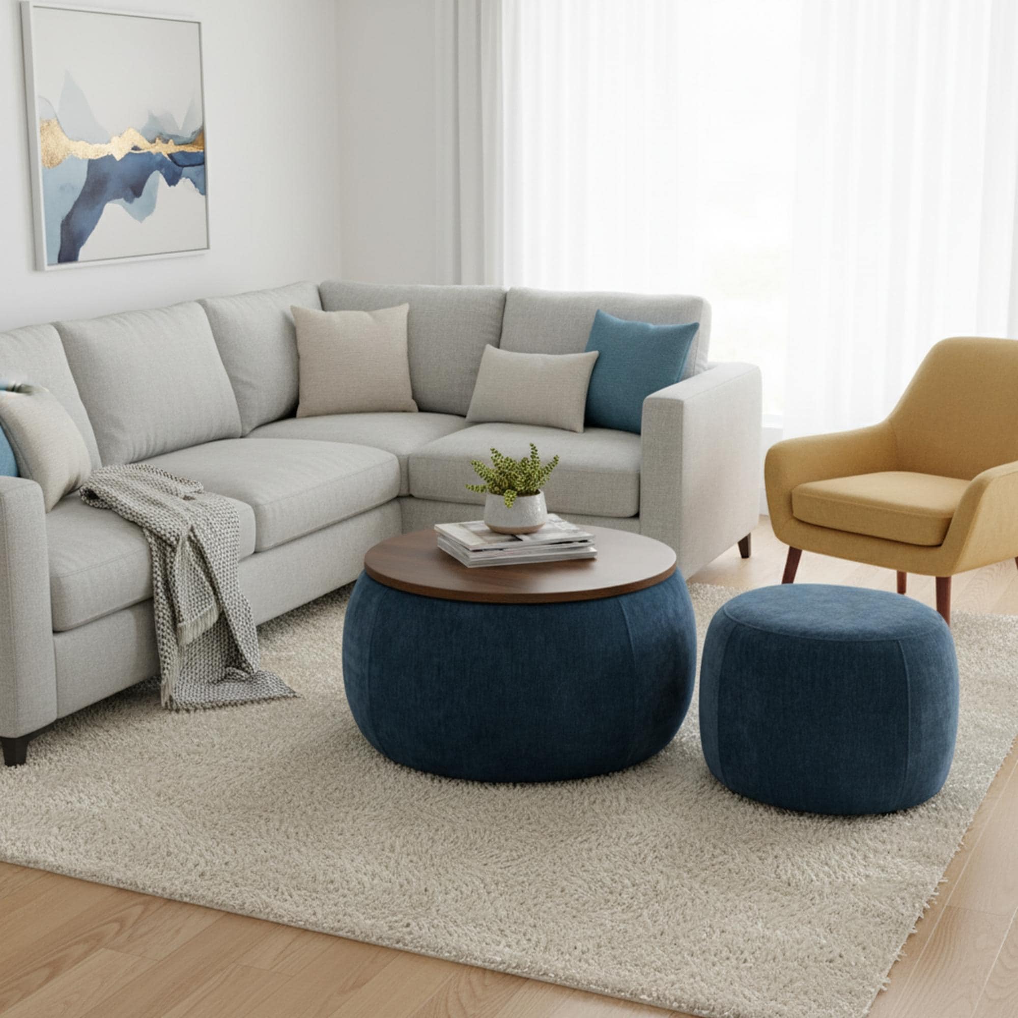 Homy Casa 2-Piece Round Fabric Ottoman Set with Storage, Pleated Upholstery Tabletop Design, No Assembly, Modern Accent