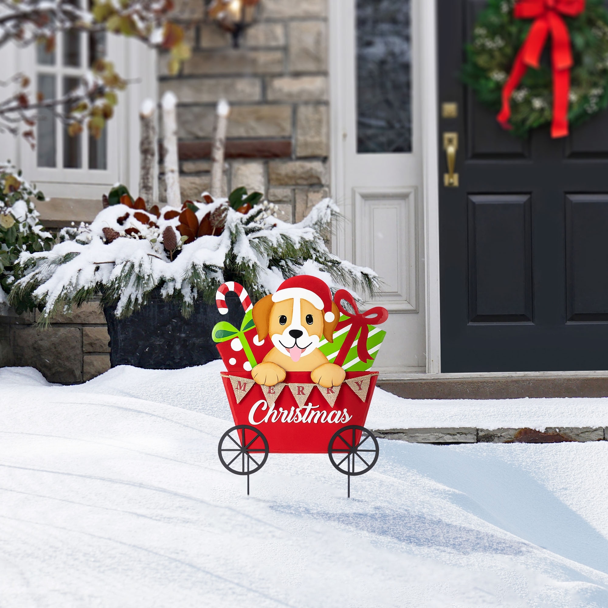 Glitzhome Metal Snowman Santa Yard Stakes Christmas Dog and Gift Cart Wall Decor
