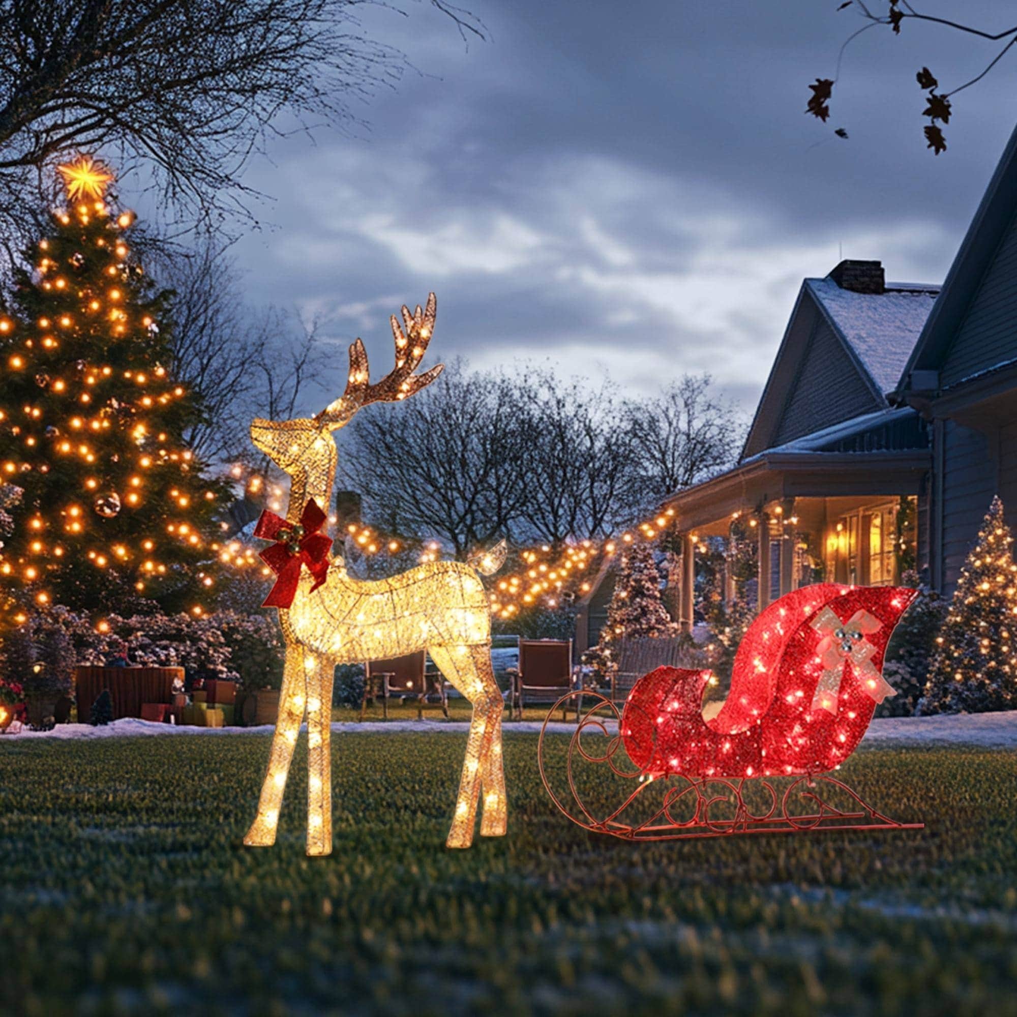 Lighted Reindeer and Sleigh Christmas Decoration, LED Reindeer Family Christmas Holiday Yard Decoration - Gold+Red