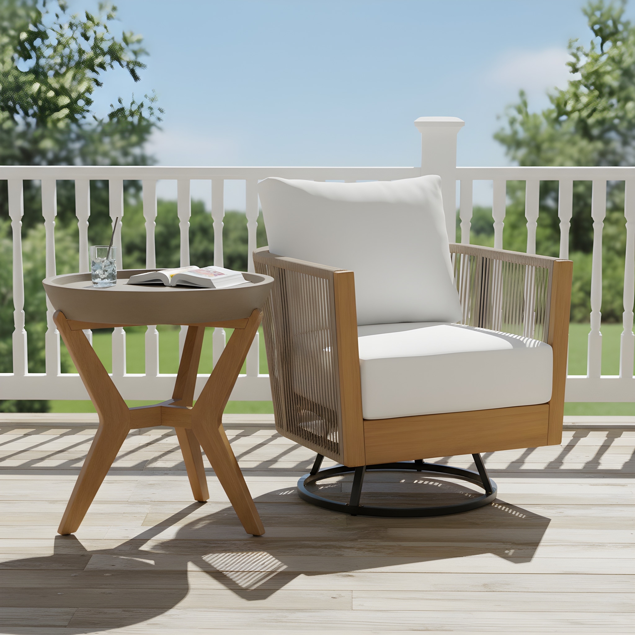 Christopher Knight Home - Outdoor Acacia Wood Rope Swivel Lounge Chair with Cushion and Concrete-Acacia Side Table