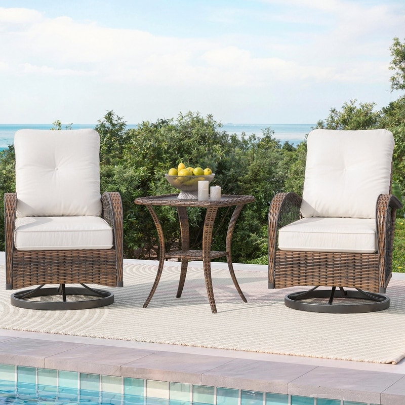 EROMMY Outdoor 3 Pieces Swivel Rocker Patio Chair Sets with Glass Table, All-Weather Wicker & Thickened Cushions for Backyard