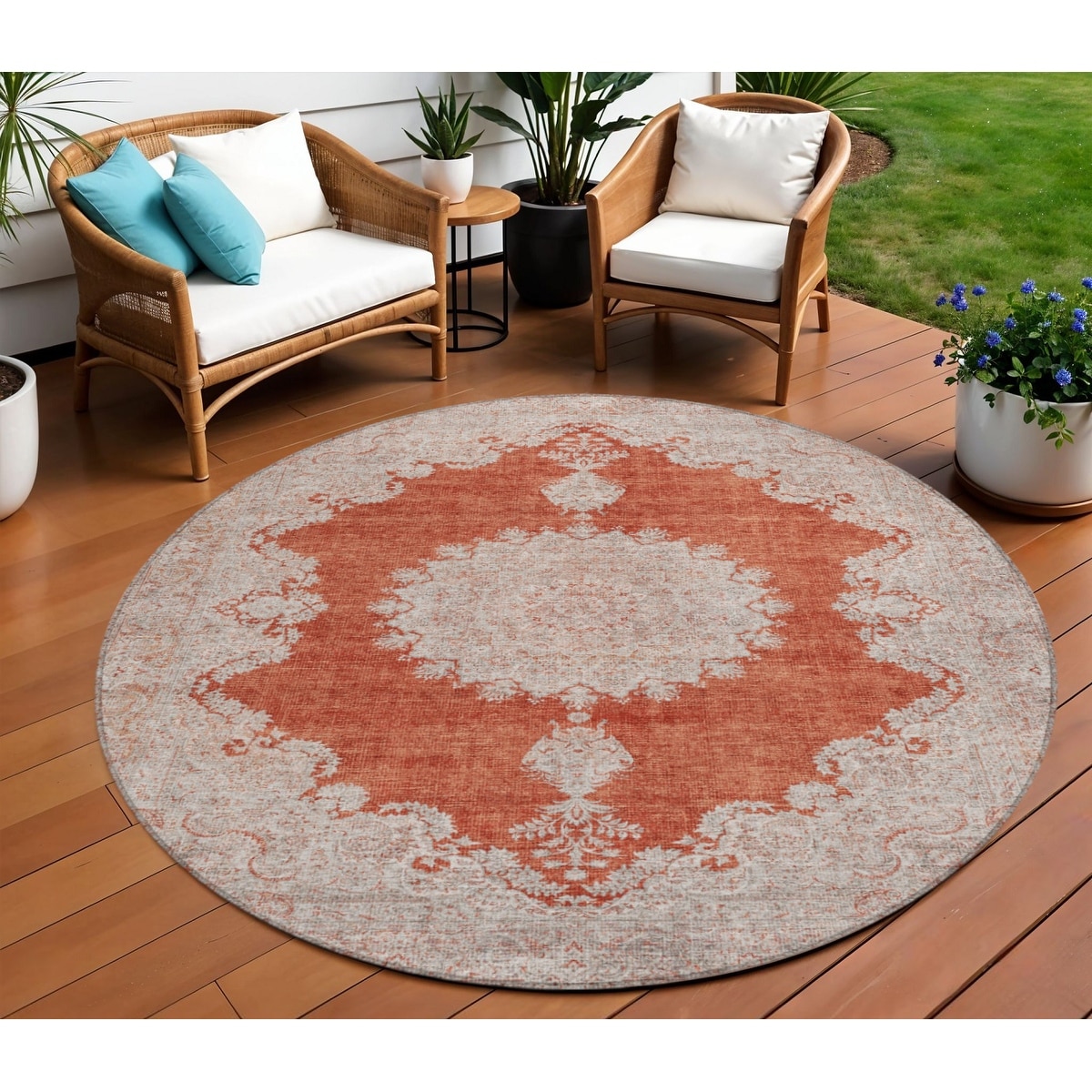 8' Rust And Beige Round Oriental Washable Indoor Outdoor Area Rug - 8' x 11'