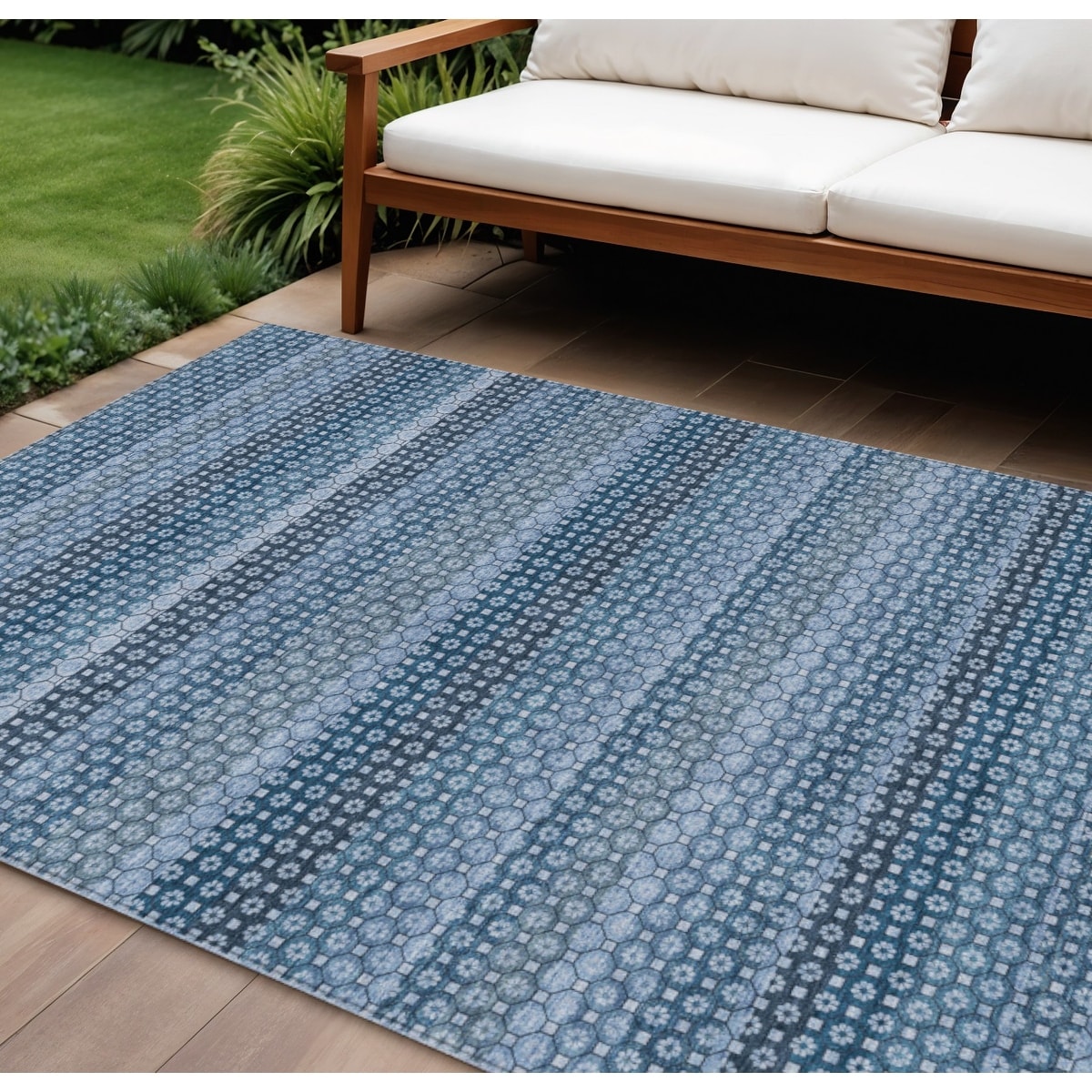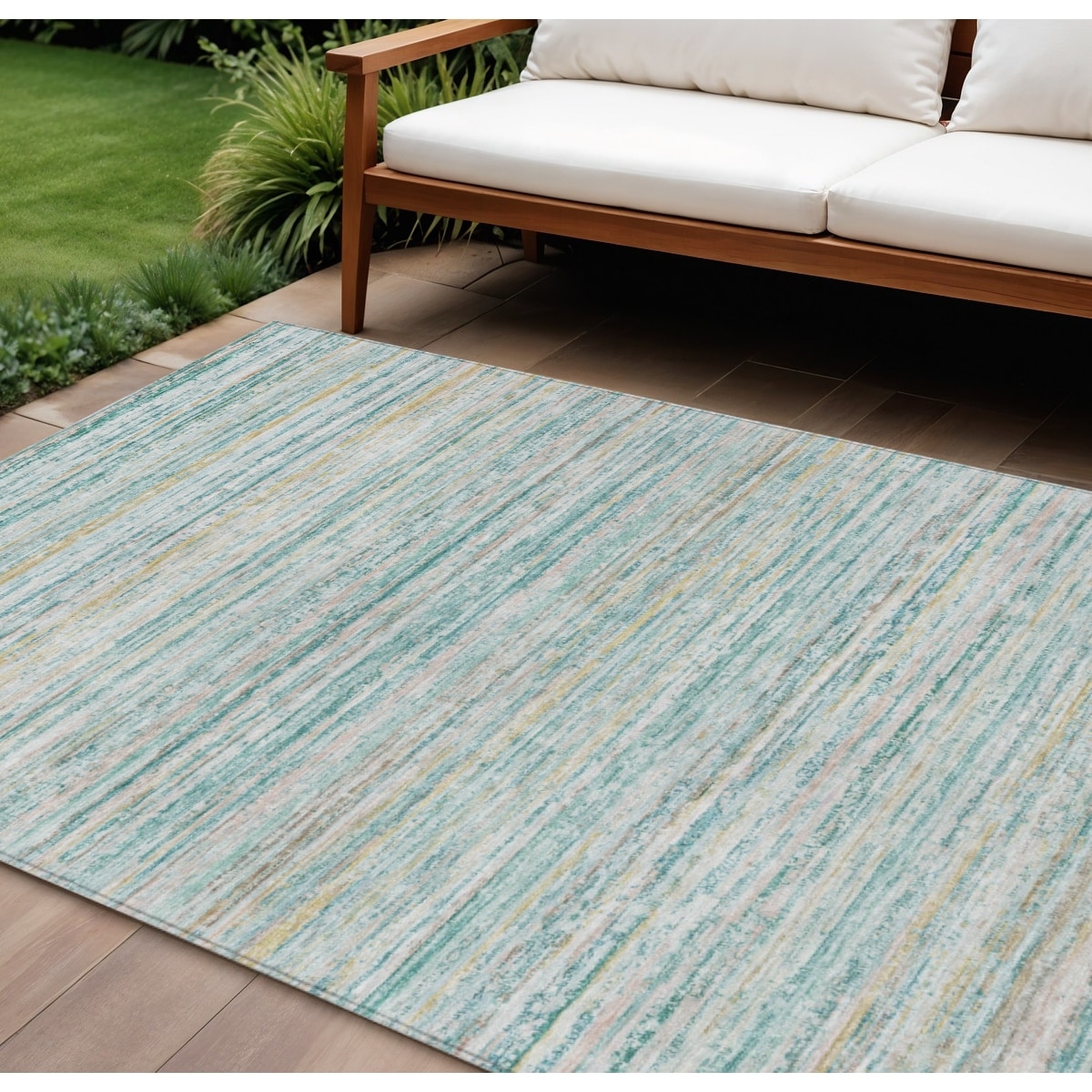 10' X 14' Teal Blue Striped Washable Indoor Outdoor Area Rug - 9' x 12'