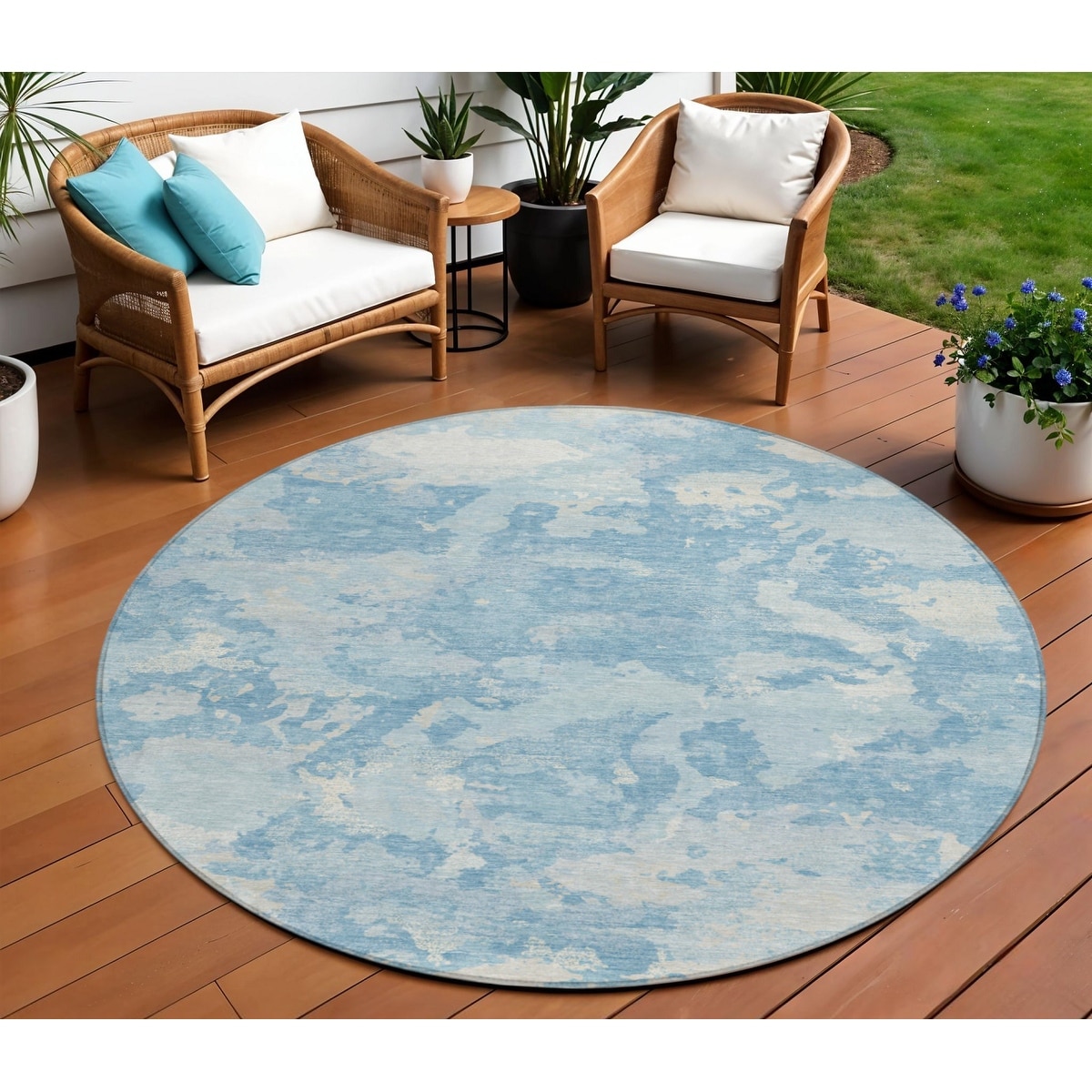 8' Sky Blue And Denim Blue Round Abstract Washable Indoor Outdoor Area Rug - 6' x 9'