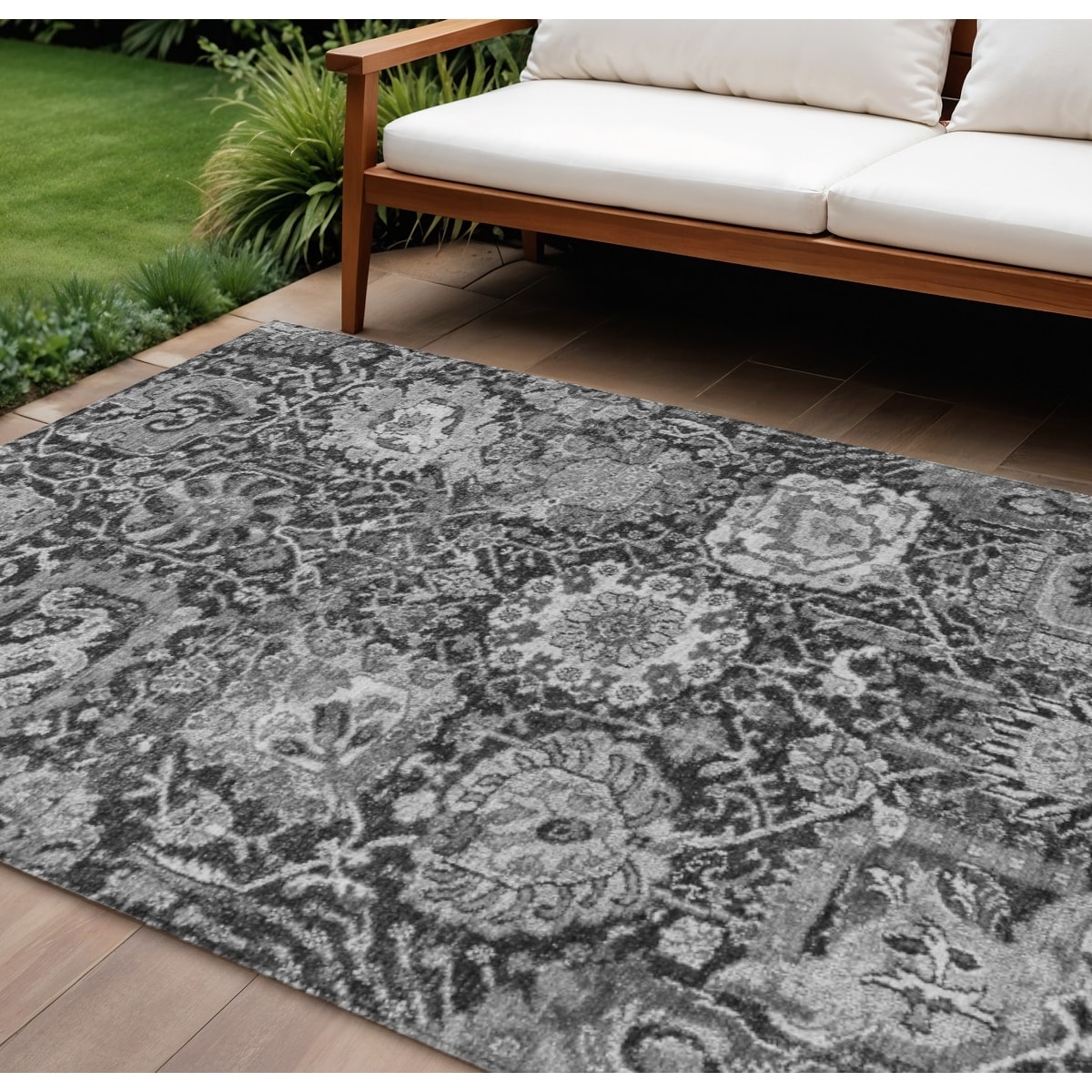 8' X 10' Gray And Ash Gray Damask Washable Indoor Outdoor Area Rug - 9' x 12'
