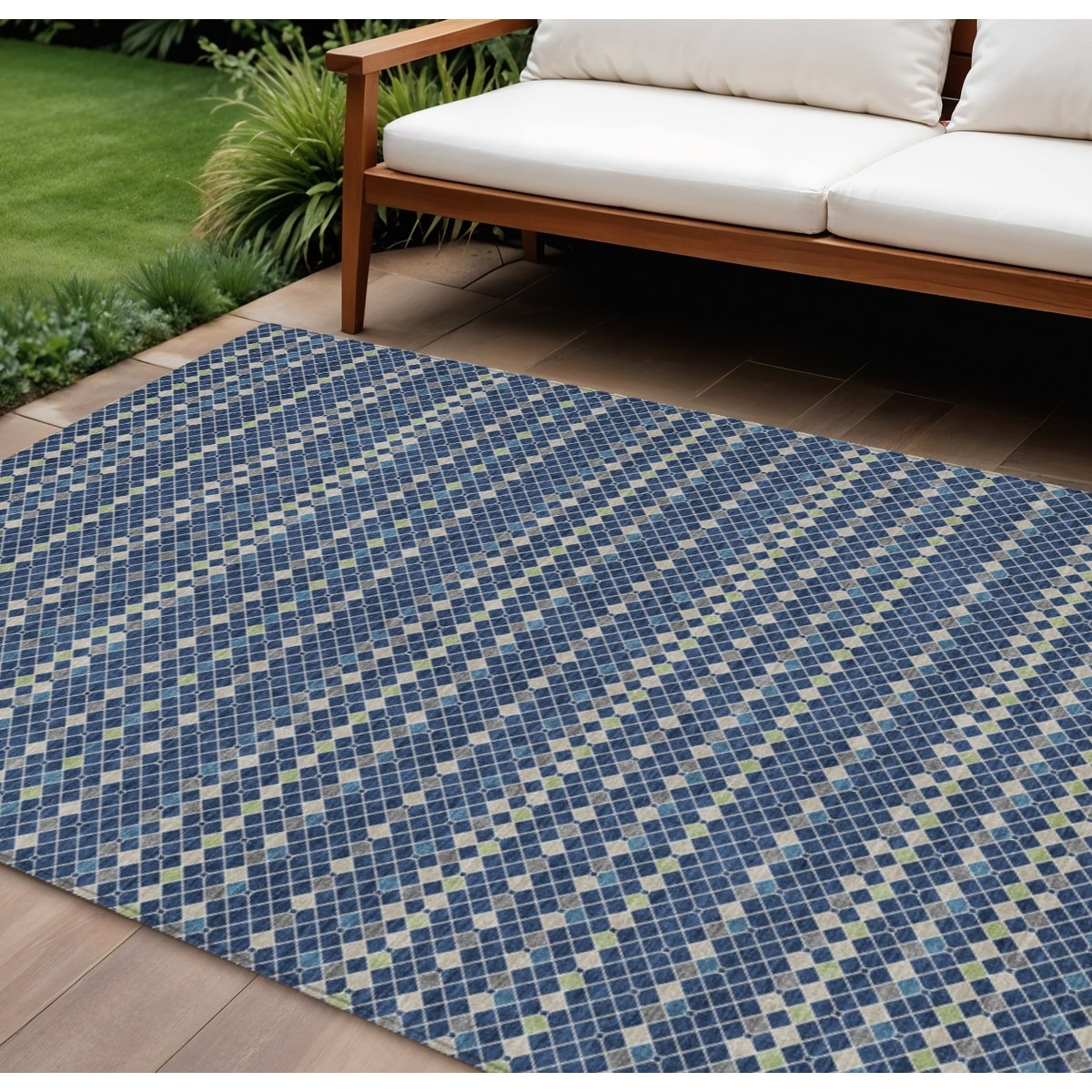 10' X 14' Navy Blue And Mint Green Striped Washable Indoor Outdoor Area Rug - 9' x 12'