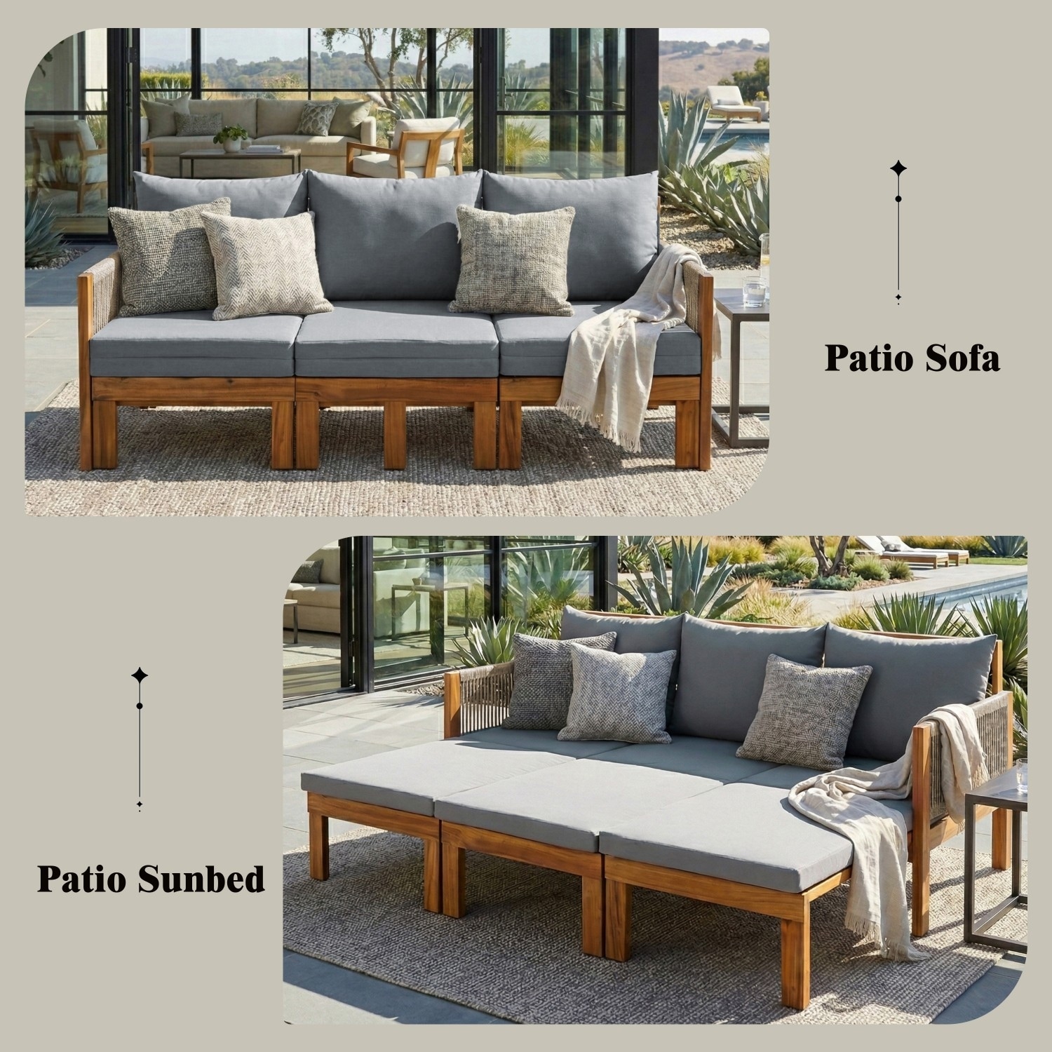 JONATHAN Y Saranac 3-Seat Mid-Century Modern Roped Acacia Wood Outdoor Sofa with Cushions