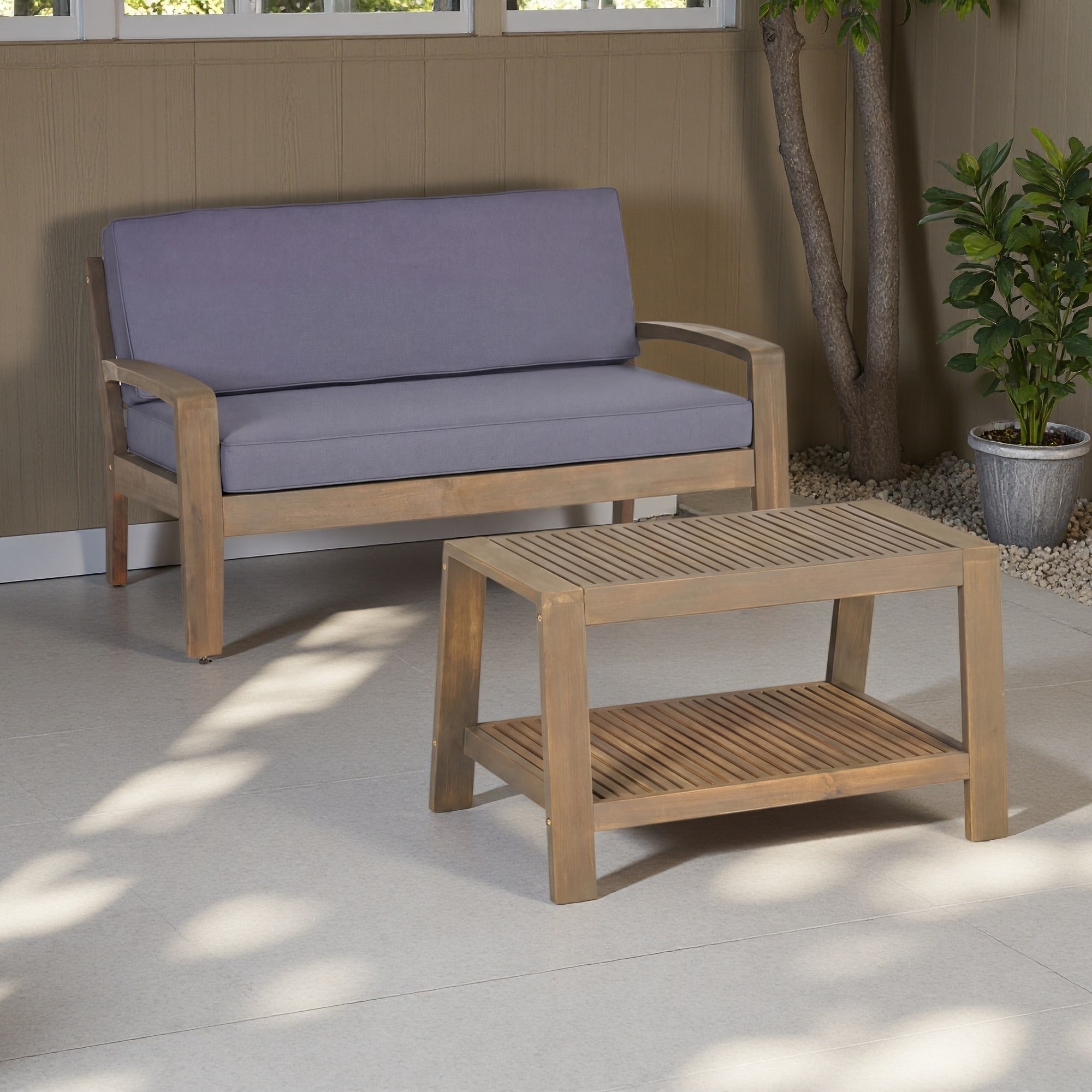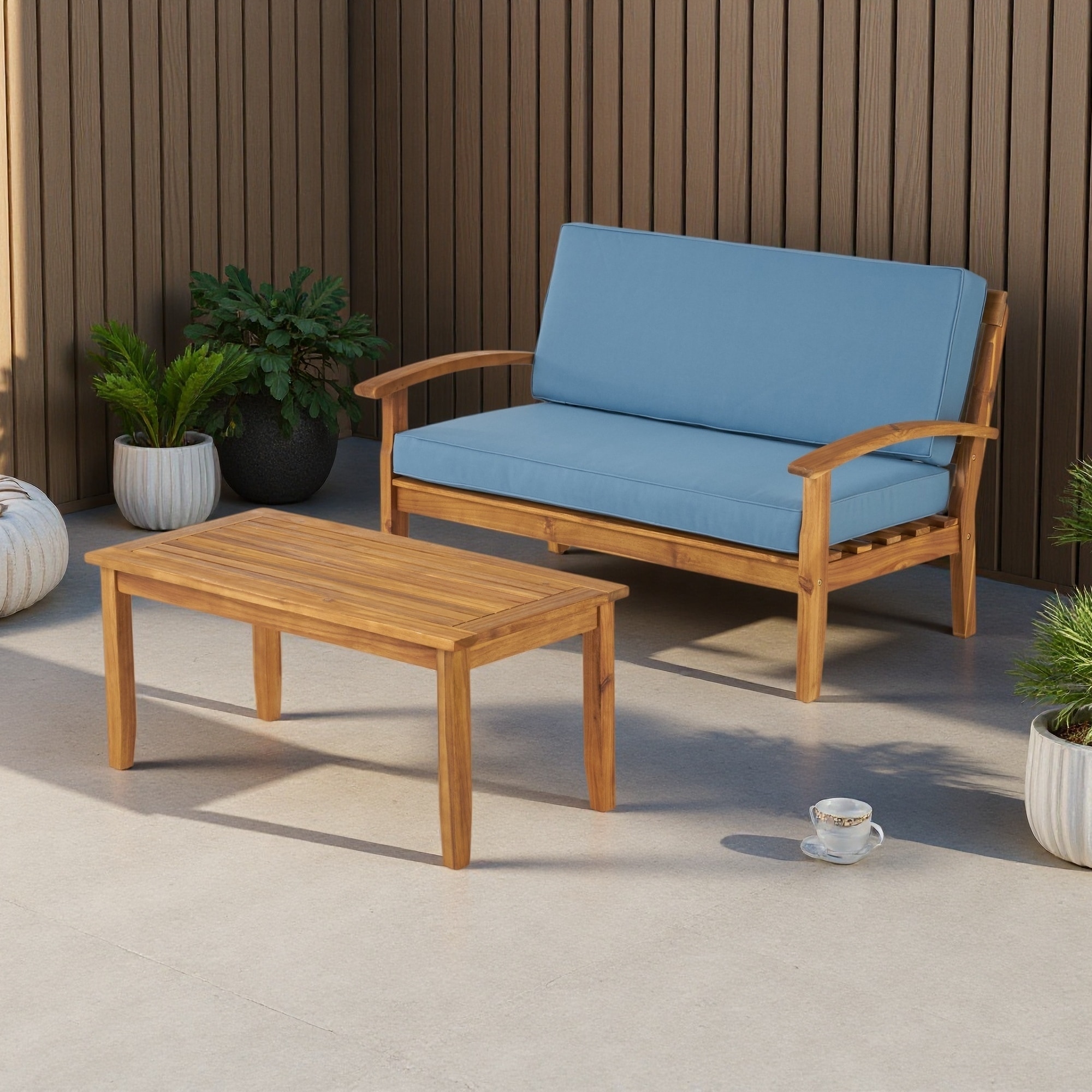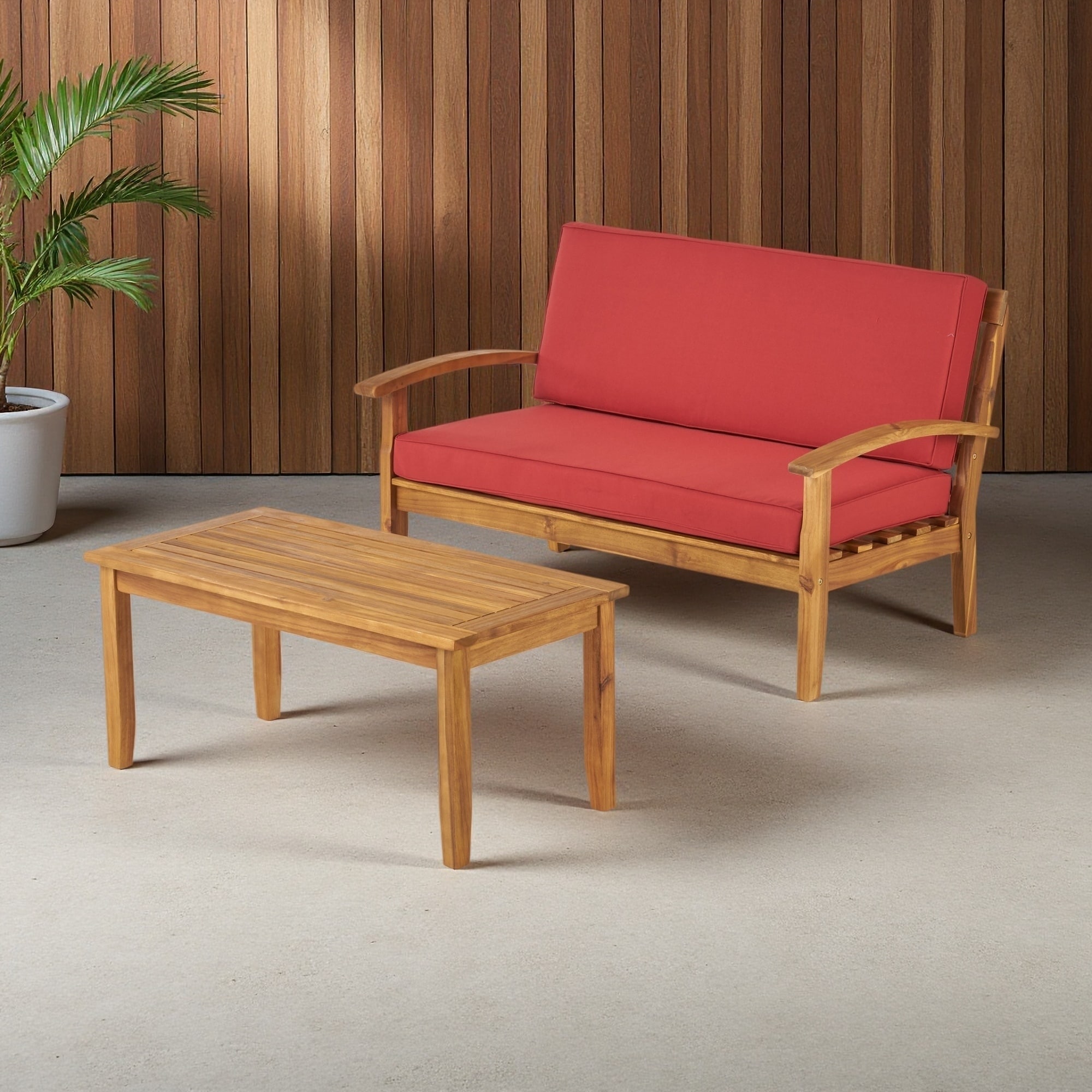 2-Piece Outdoor Acacia Wood Water-Resistant Loveseat Set with Polyester Cushions and Coffee Table