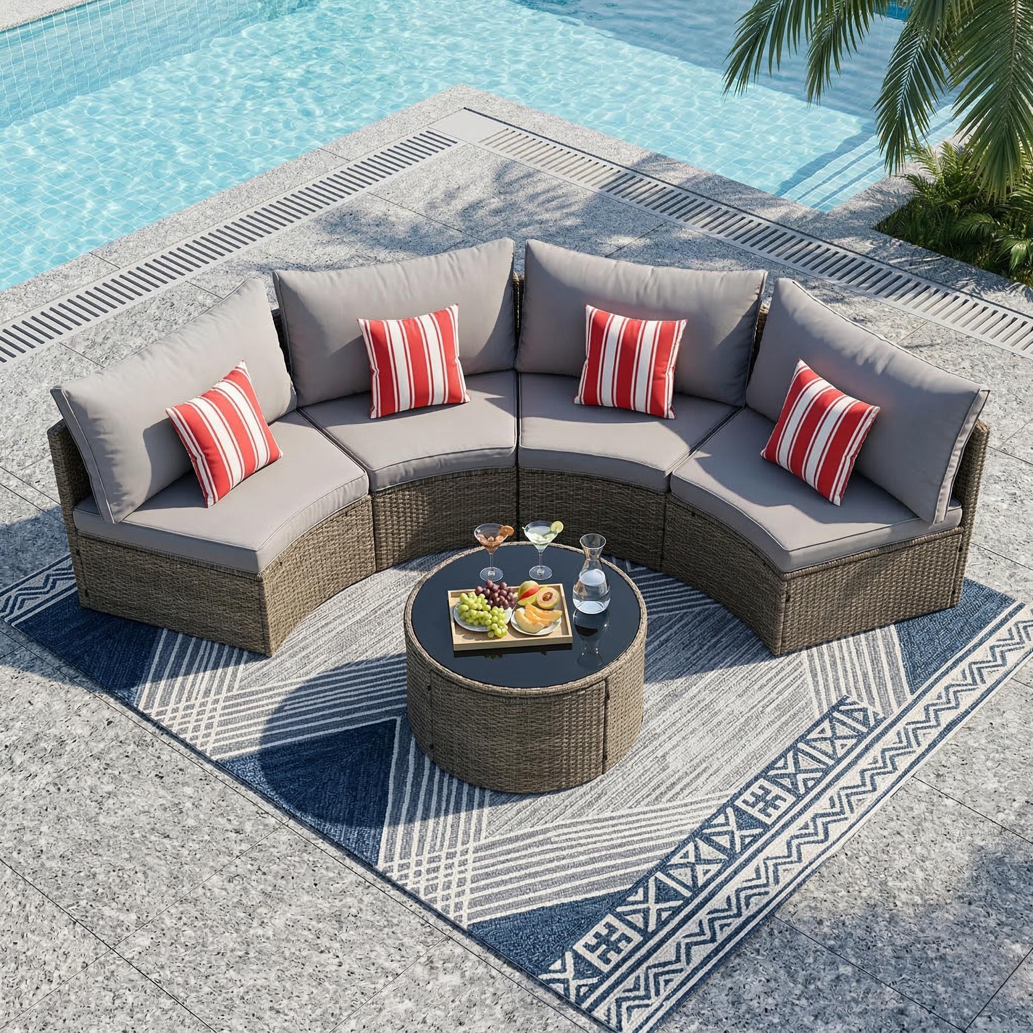 GDFStudio - Outdoor Half-Moon Wicker Sectional Sofa Set with Table, Modular Patio Conversation Set