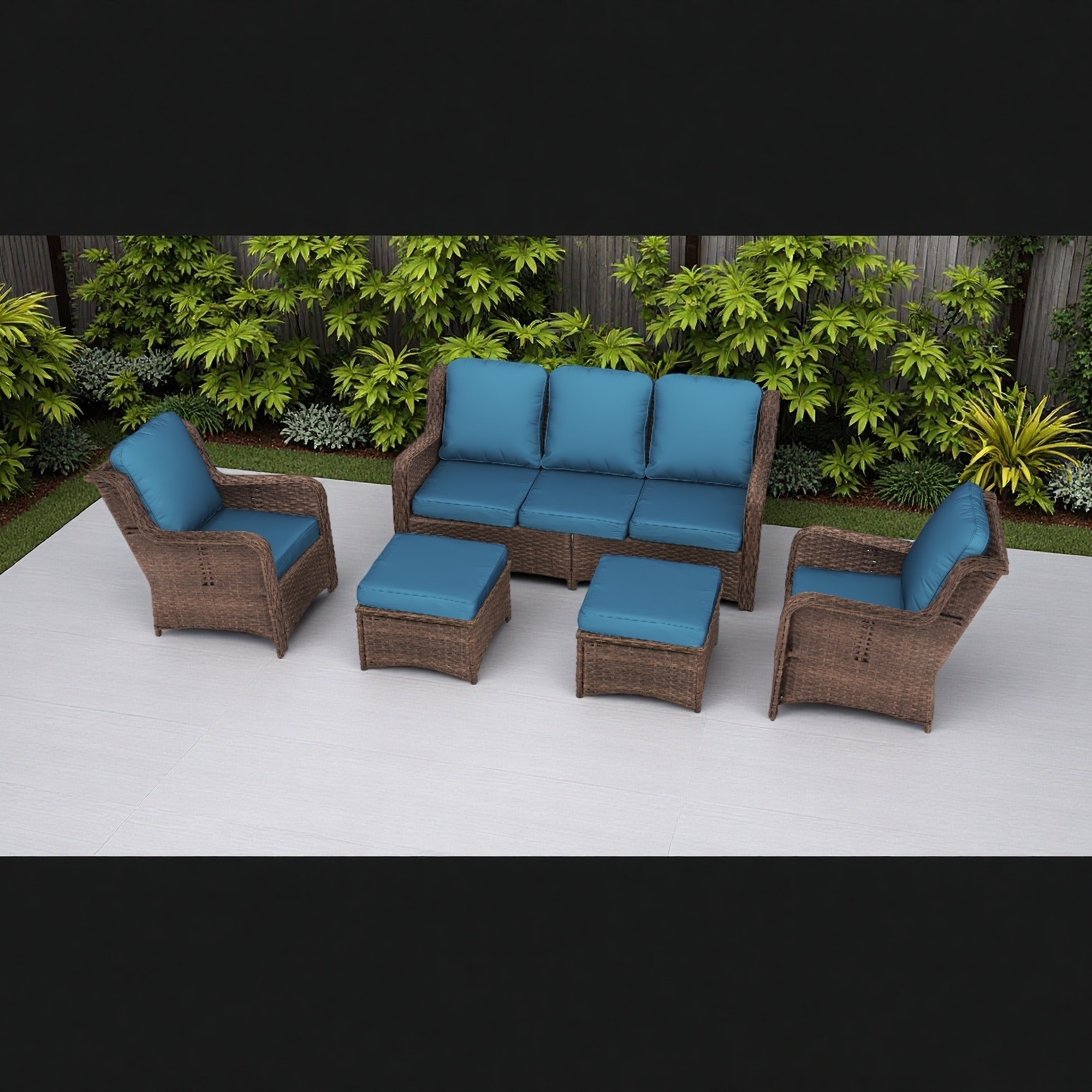 5-Piece Outdoor Wicker Steel Frame Sectional Set with 3-Seater Sofa, 2 Armchairs, 2 Ottomans and Peacock Cushions