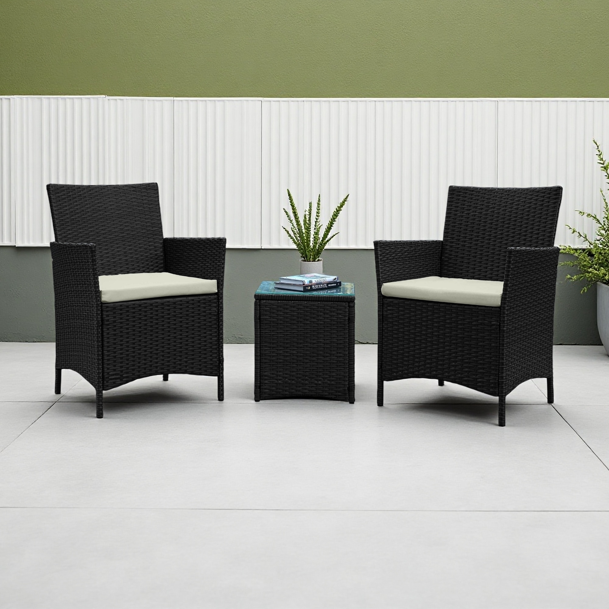 3-Piece Outdoor Wicker Steel Frame Chair Set with 2 Armchairs, Side Table and Cushions