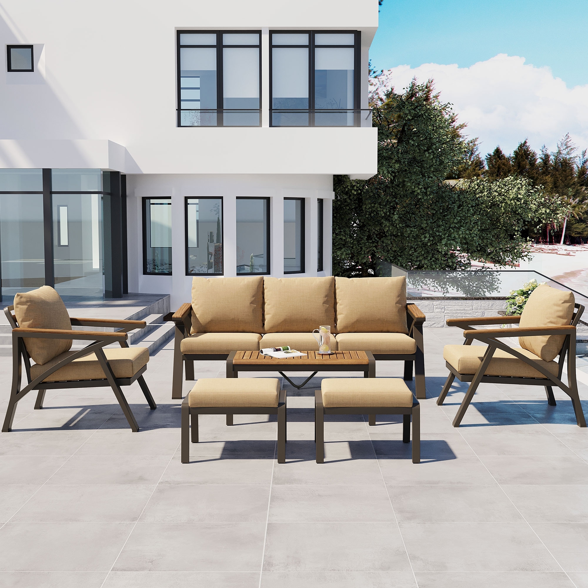 Christopher Knight Home - 6 Piece Conversation Set Steel Frame with Acacia Wood Coffee Table, Cushioned Seating & Ottomans