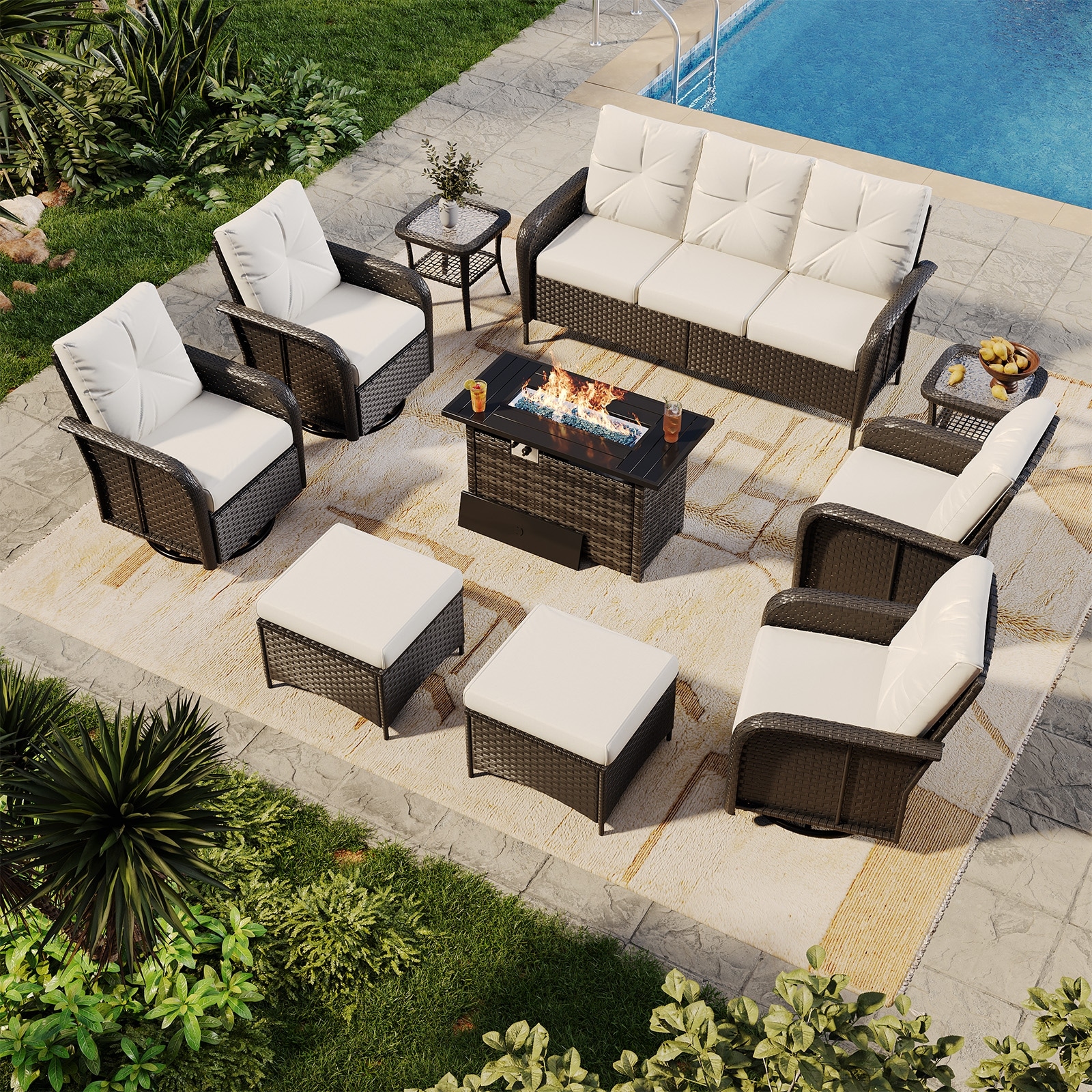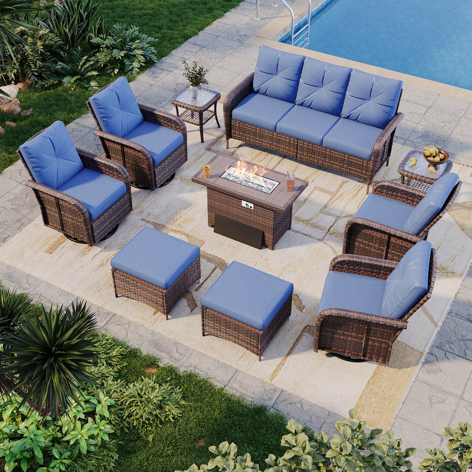 OVIOS 9 Pieces Outdoor Swivel Chairs Set with 54" Fire Table