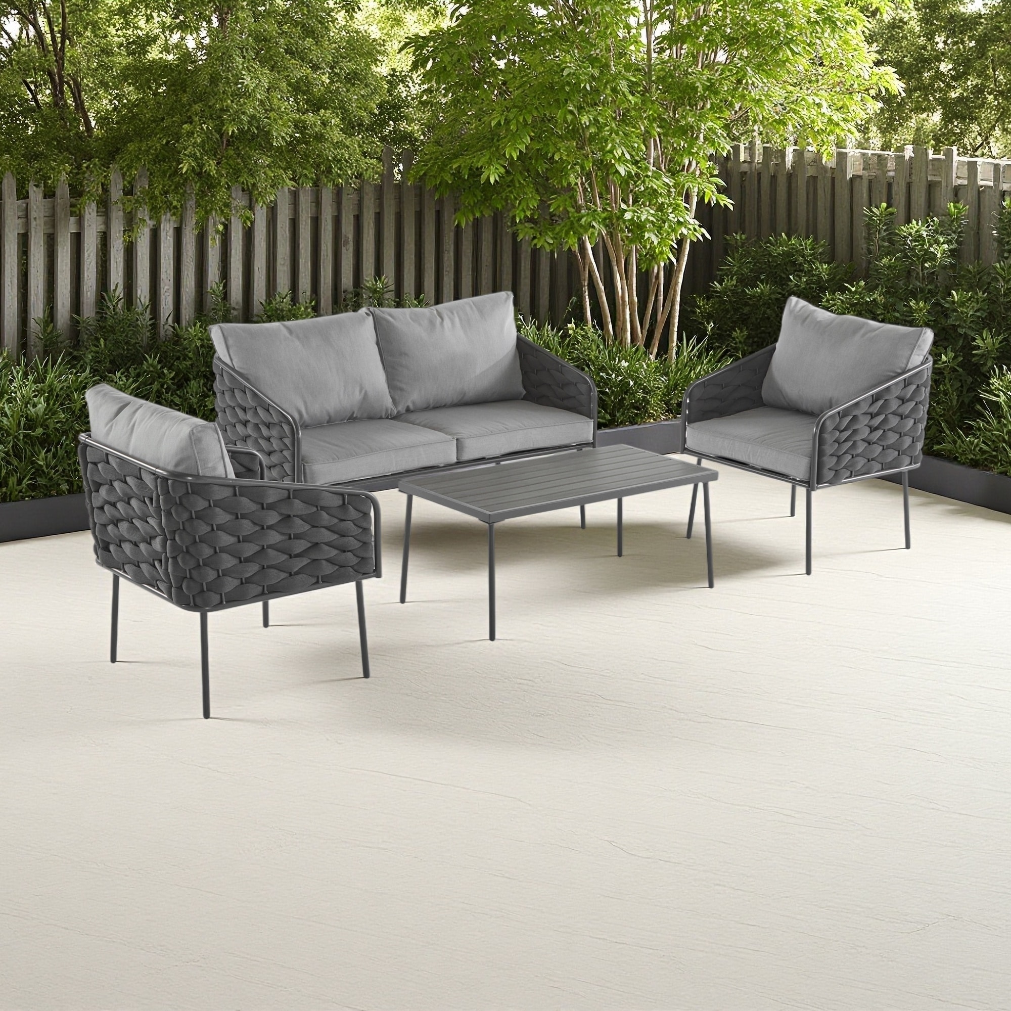 Outdoor Conversation Set 4-Piece Eucalyptus Wood 3-Seater Sofa Weather‑resistant Rope Weave with Coffee Table
