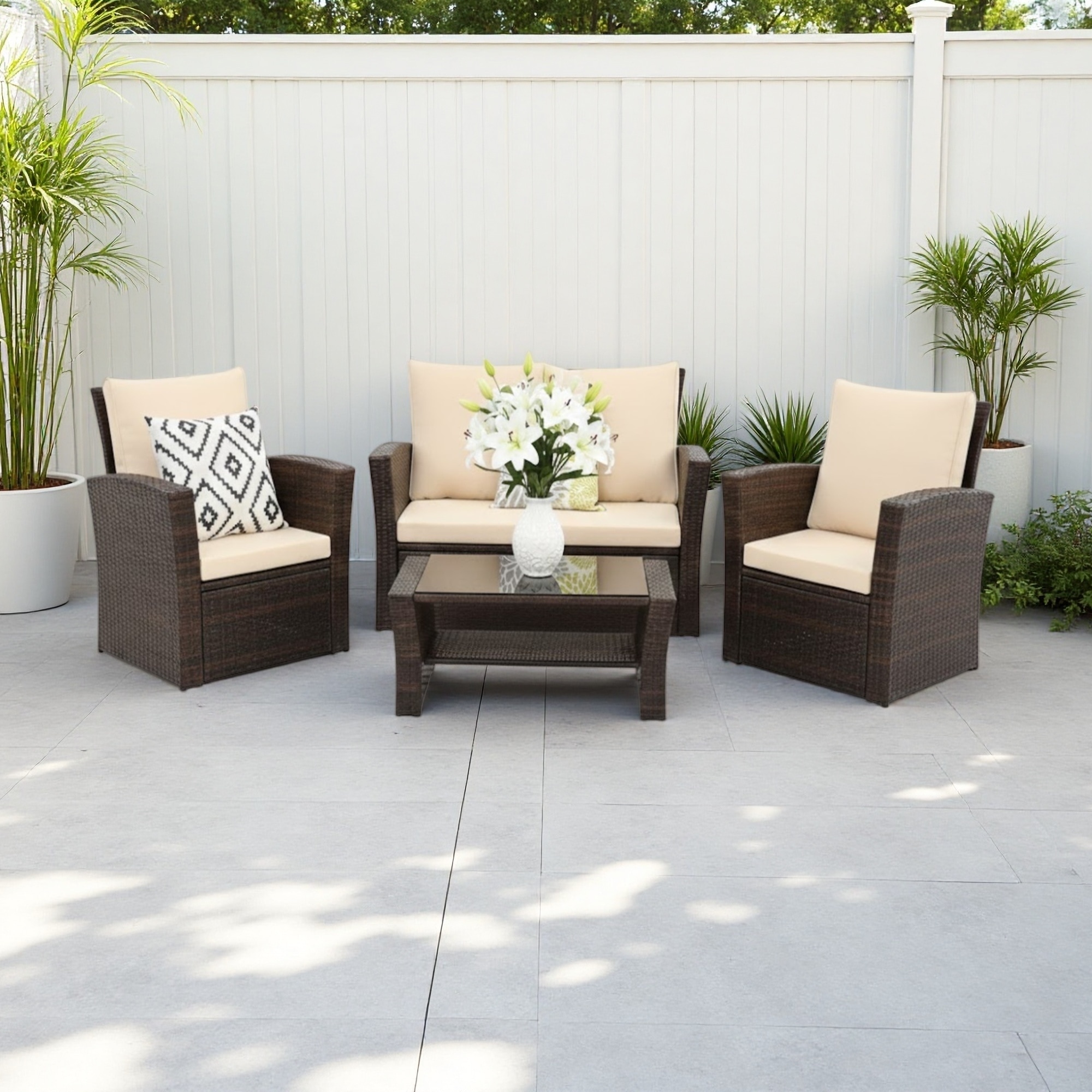 4-Piece Outdoor PE Wicker Loveseat Set with 3" Removable Cushions and Tempered Glass Table