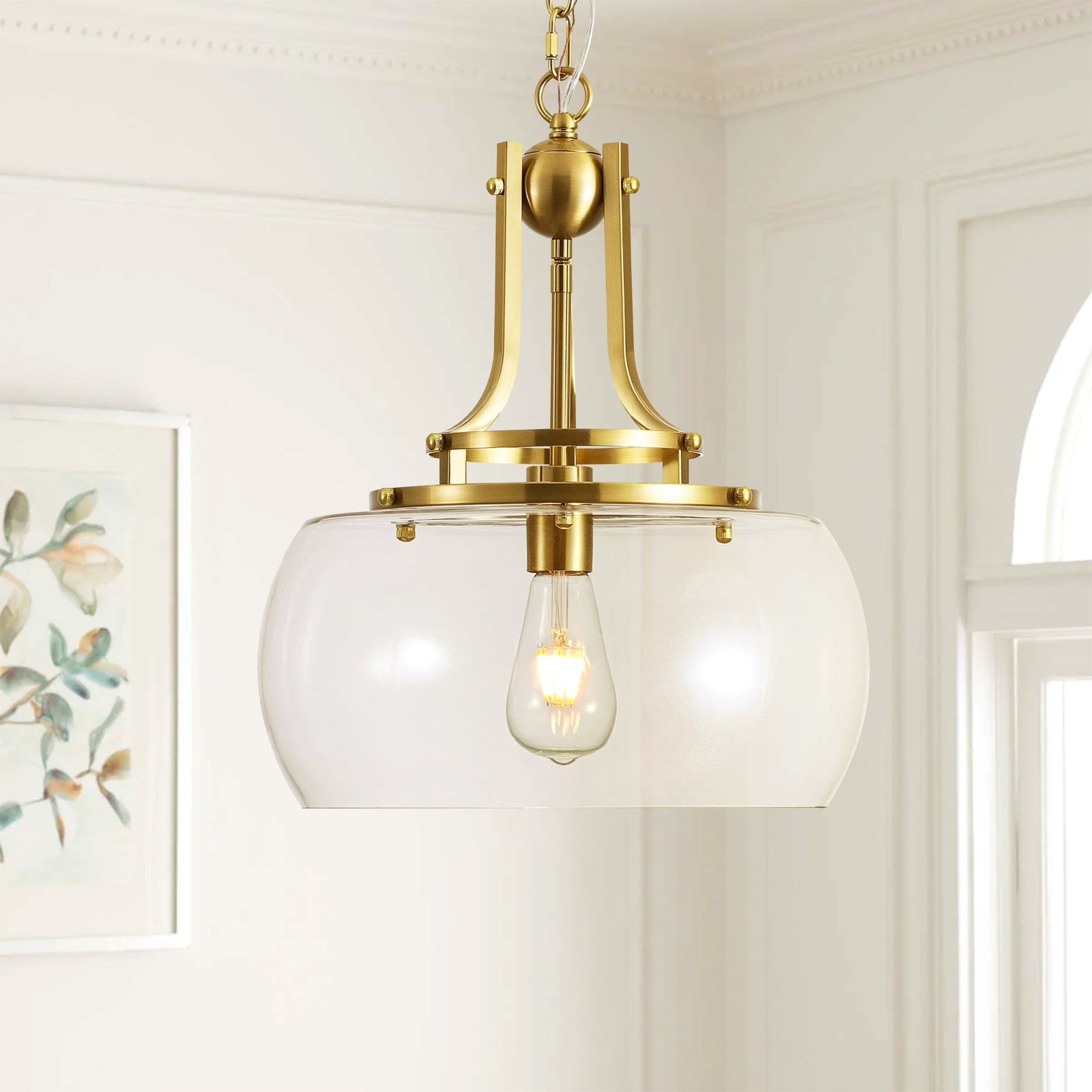 13.8" W Mid-Century Modern Rustic Gold Dome Design Ceiling Pendant with Clear Glass Shade for Dining Room, Kitchen Island, Foyer