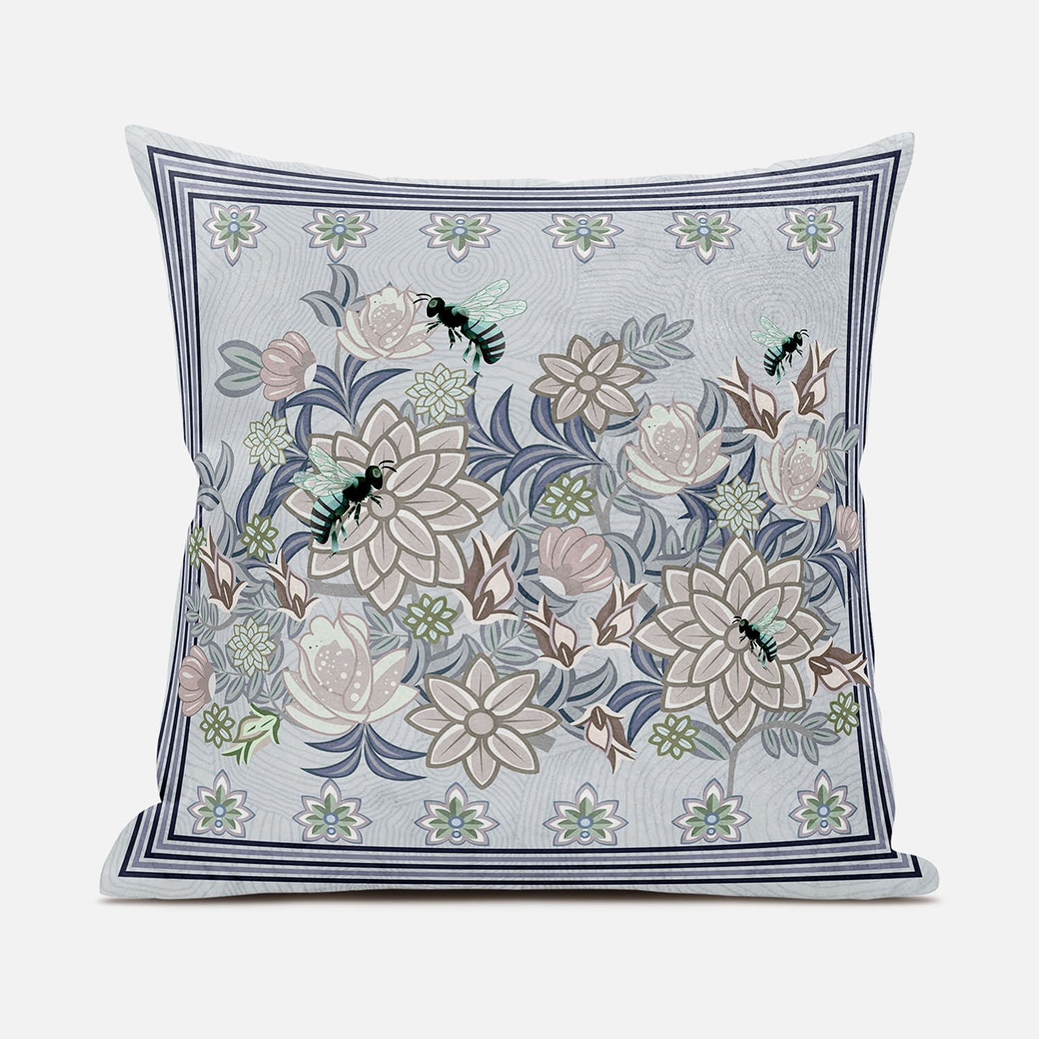 16x16 Beige Blue Gray Blown Seam Broadcloth Floral Throw Pillow