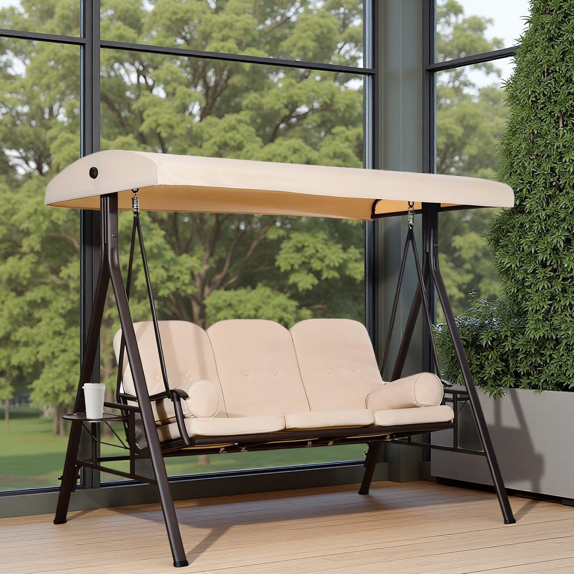 Outdoor 3-Seat Porch Swing with Adjustable Canopy & Cup Holder,Porch Swing Glider Chair, Heavy-Duty Steel Frame