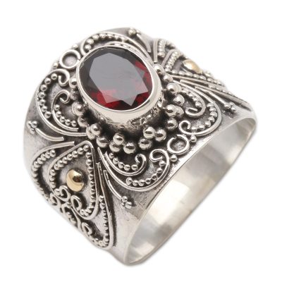 Oval Crimson Glow,'Balinese Silver and Oval Garnet Ring with Gold Accents'