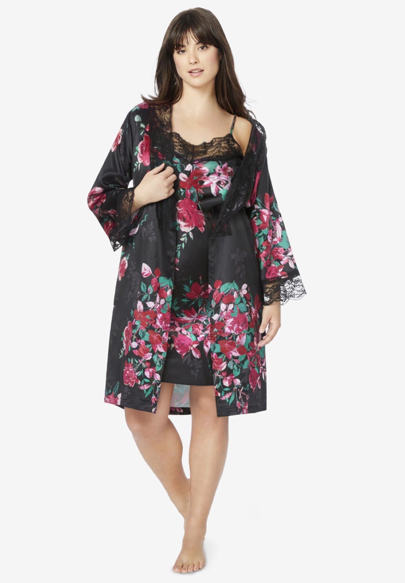 Plus Size Women's The Luxe Satin Short Peignoir Set by Amoureuse in Black Floral (Size 3X) Pajamas