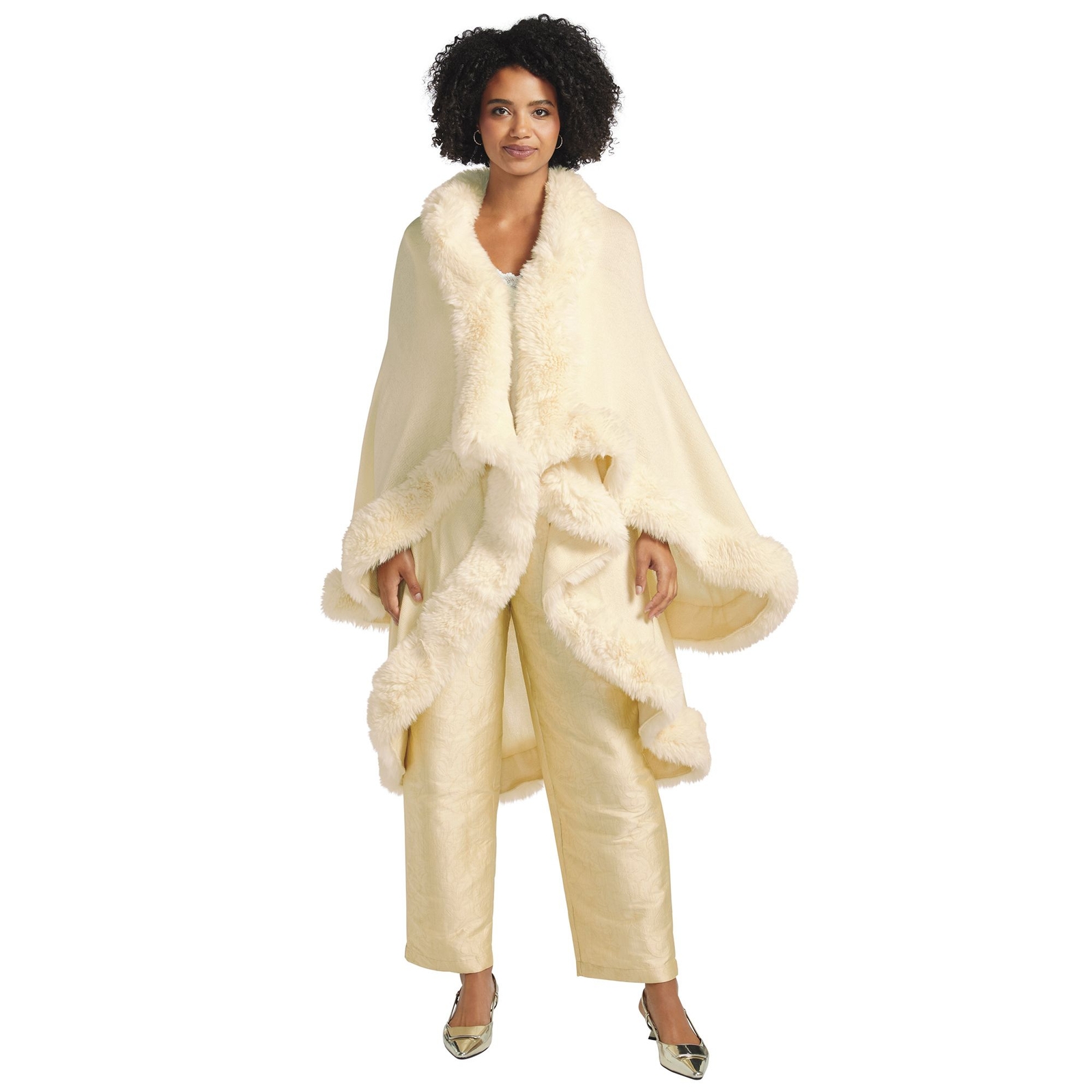 Masseys Faux Fur Trim Shawl (Size 2X/3X) Ivory, Acrylic,Nylon,Polyester