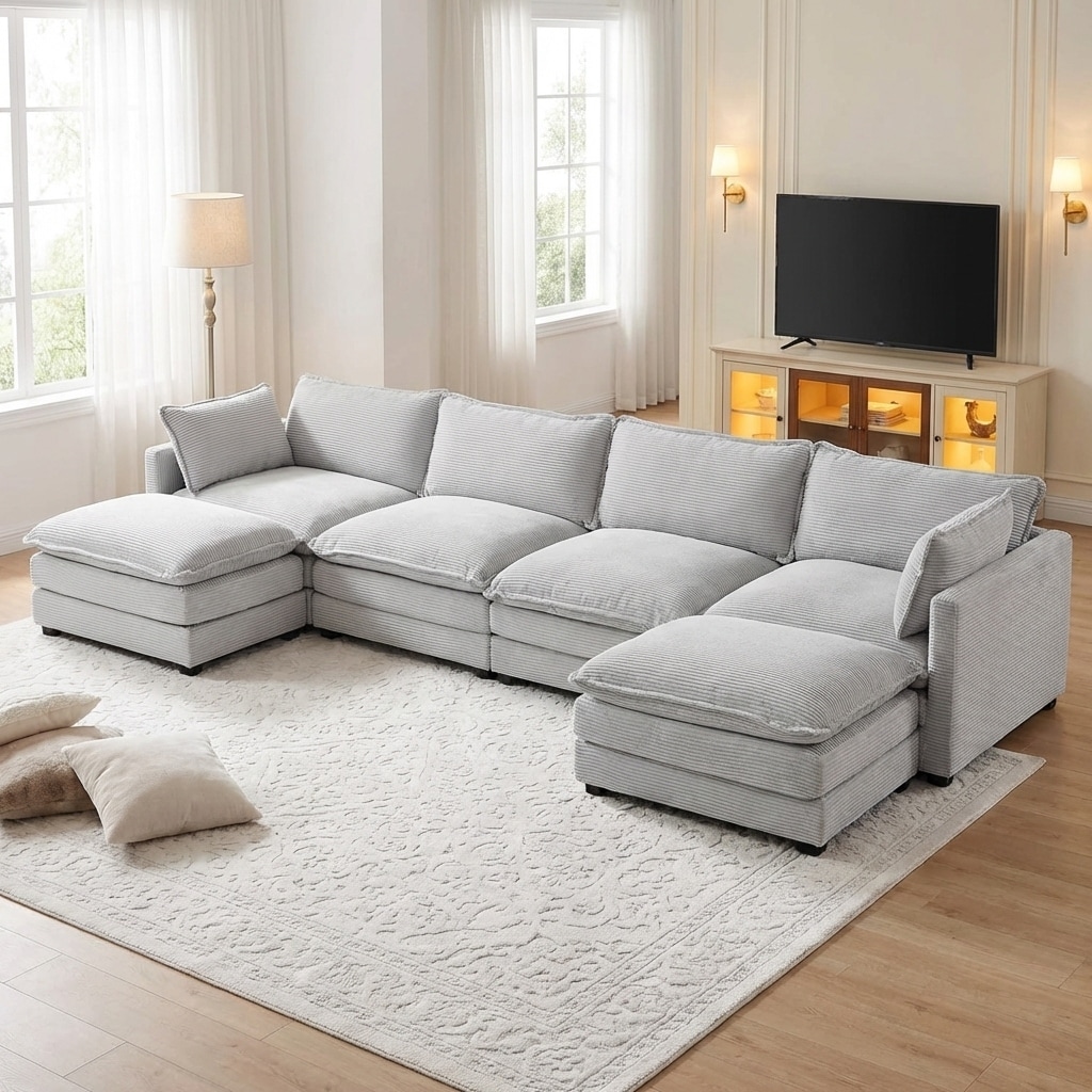GDFStudio - Corduroy U-Shaped 3-Seater 130" Cloud Modular Sectional Couch with 2 Ottomans