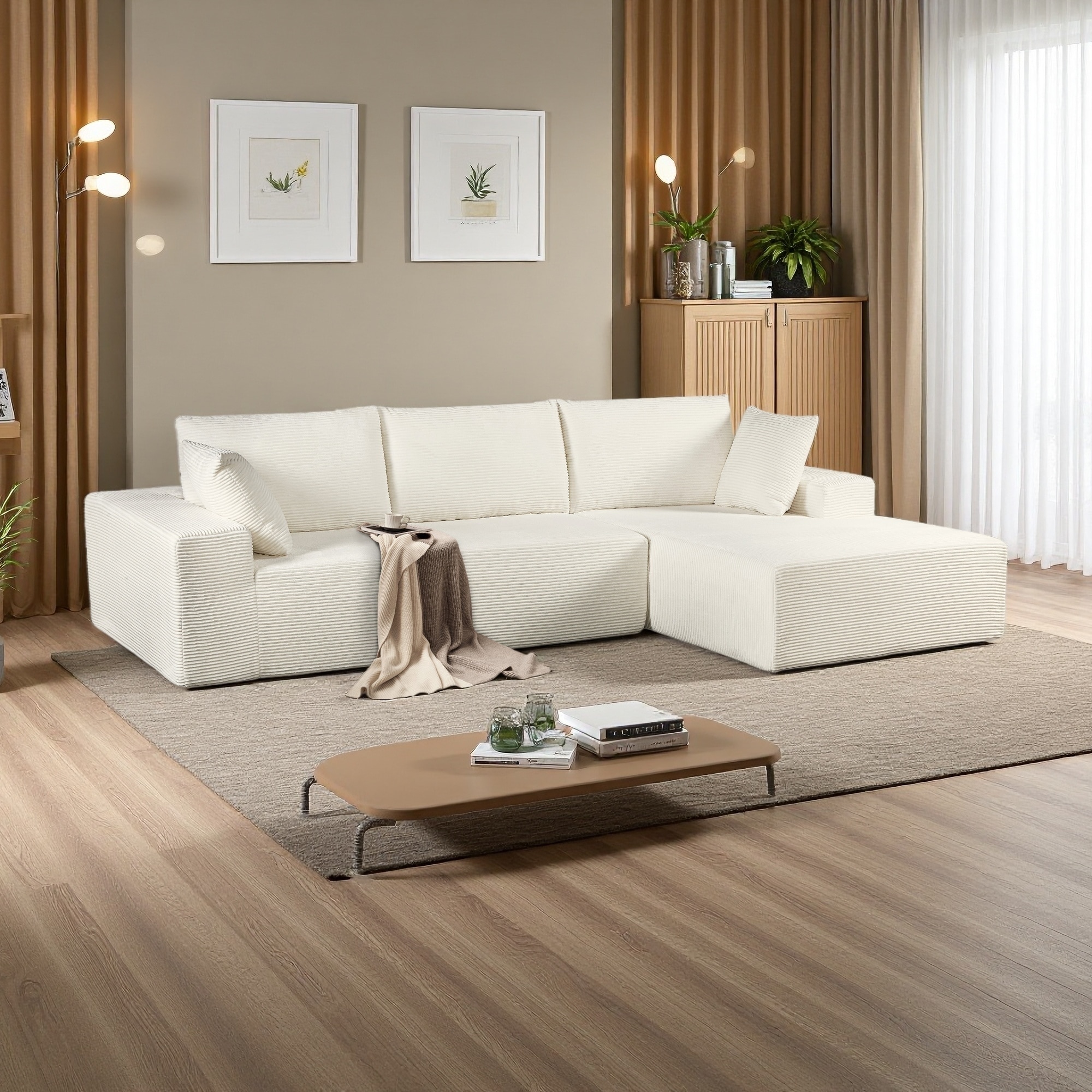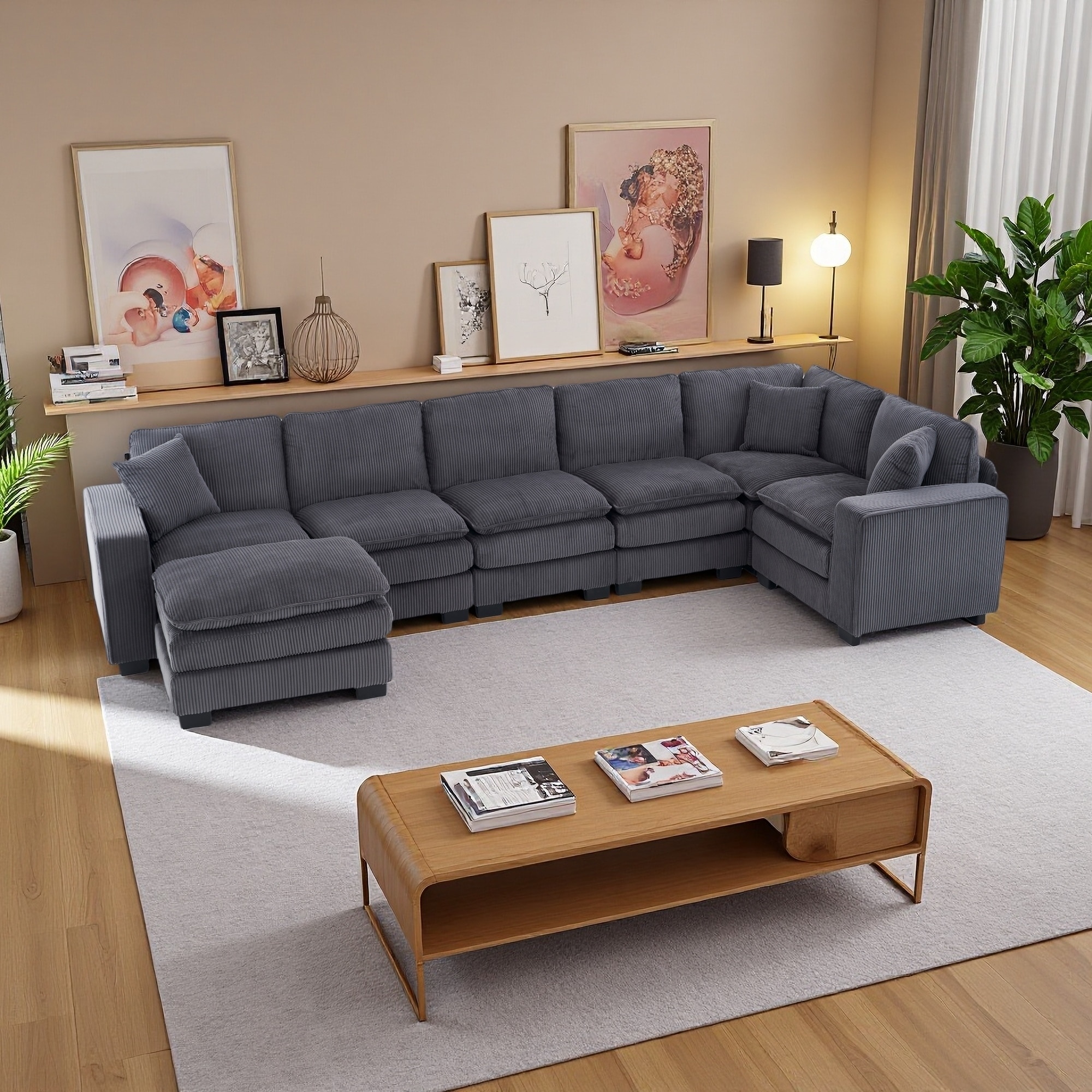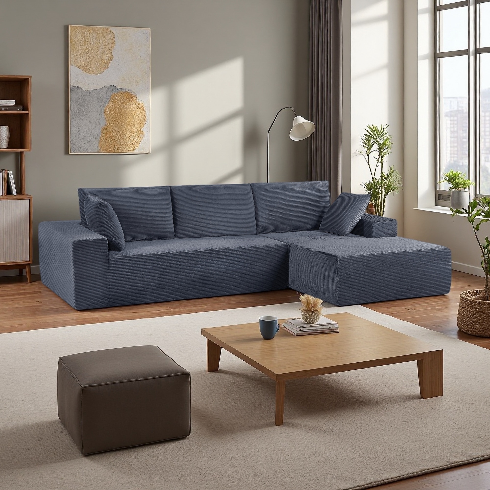 Modular Deep Seat Corner Sofa Corduroy Upholstered L-shaped Sectional Couch with Ottoman and Double-layer Seat Cushions