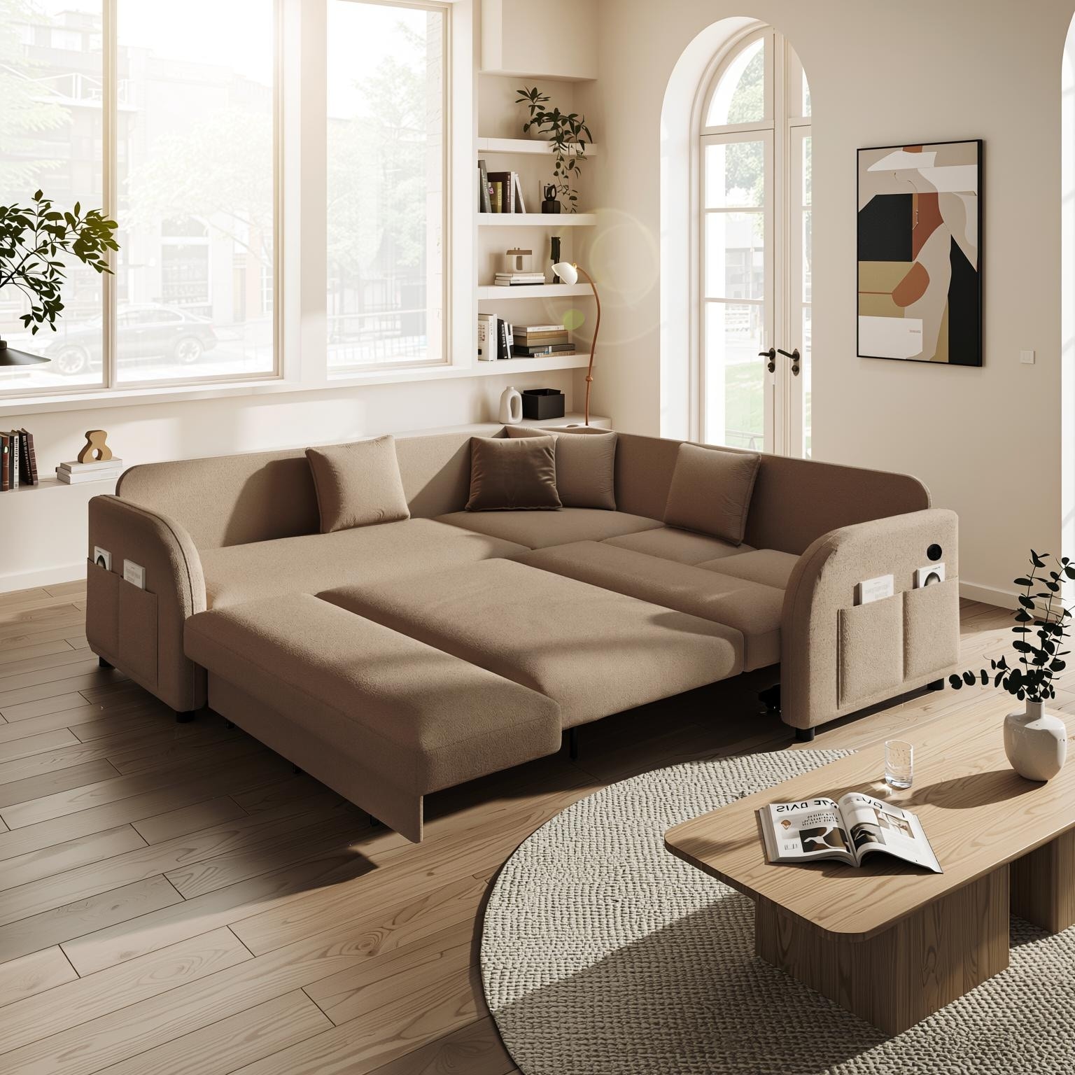 Homy Casa 85"/115" L-Shaped Sectional Sofa Bed USB & Side Pocket, Teddy Fabric Pull-Out Sleeper, Reversible Chaise, Multi Colors