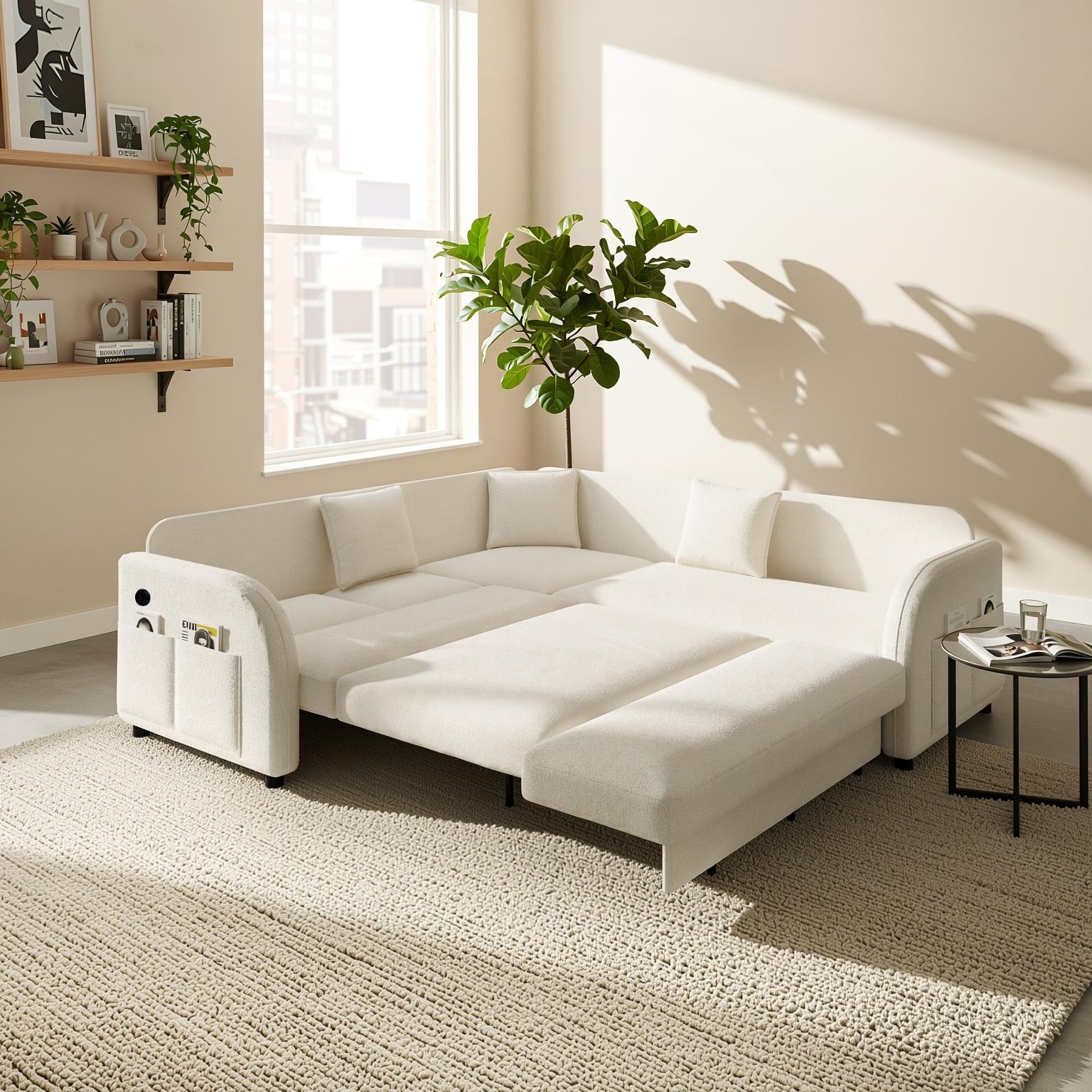Homy Casa 85"/115" L-Shaped Sectional Sofa Bed USB & Side Pocket, Teddy Fabric Pull-Out Sleeper, Reversible Chaise, Multi Colors