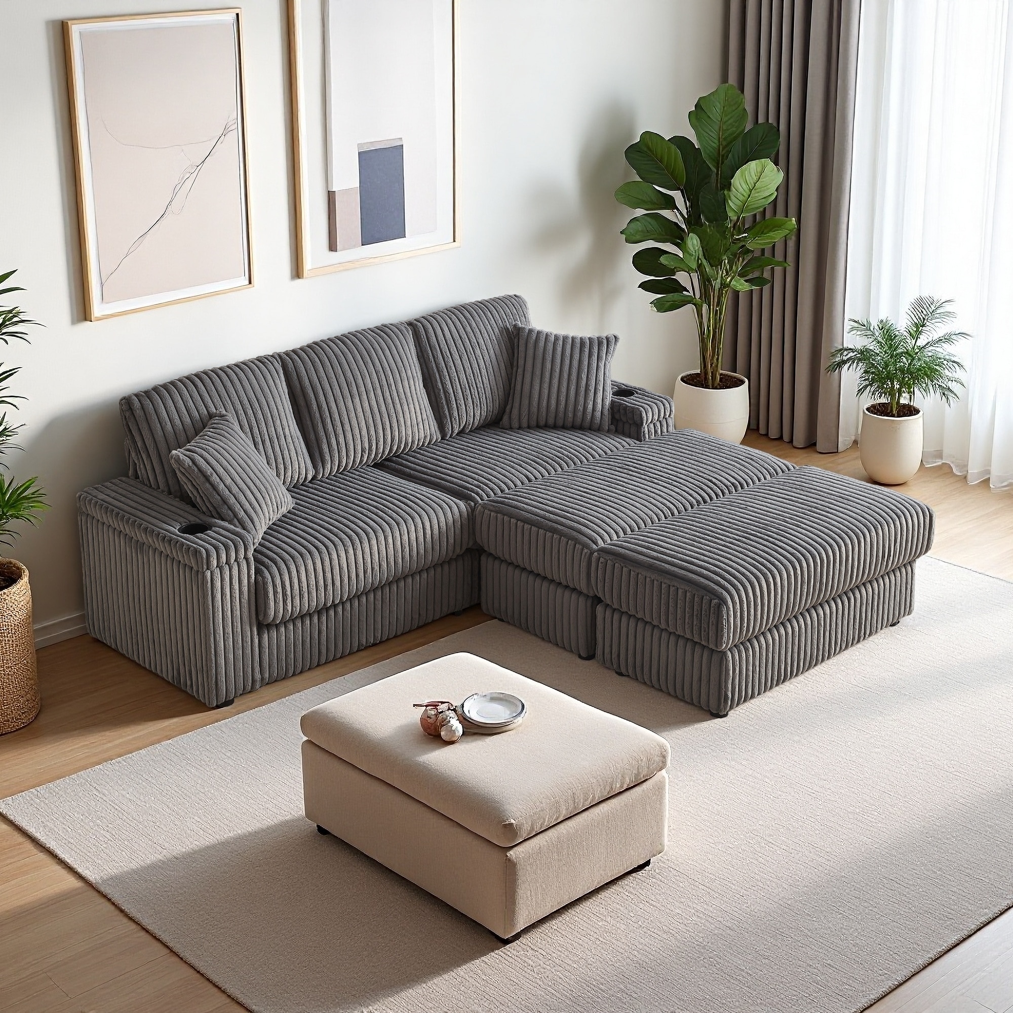 Corduroy L-shape Modular Corner Sectional Sofa with Reversible Storage Ottoman