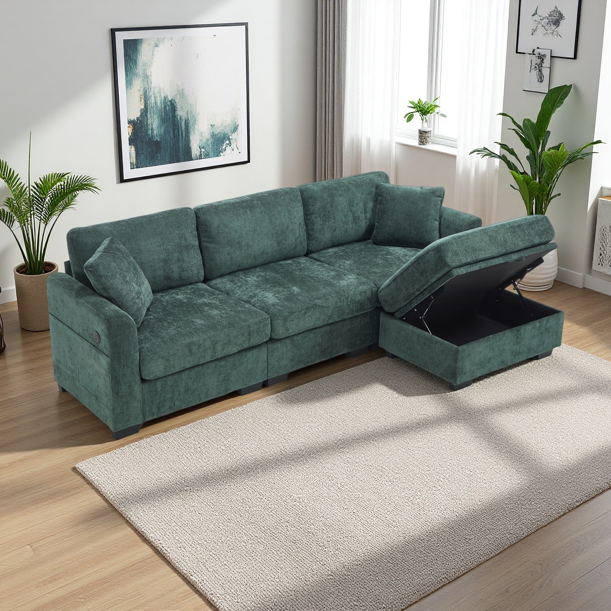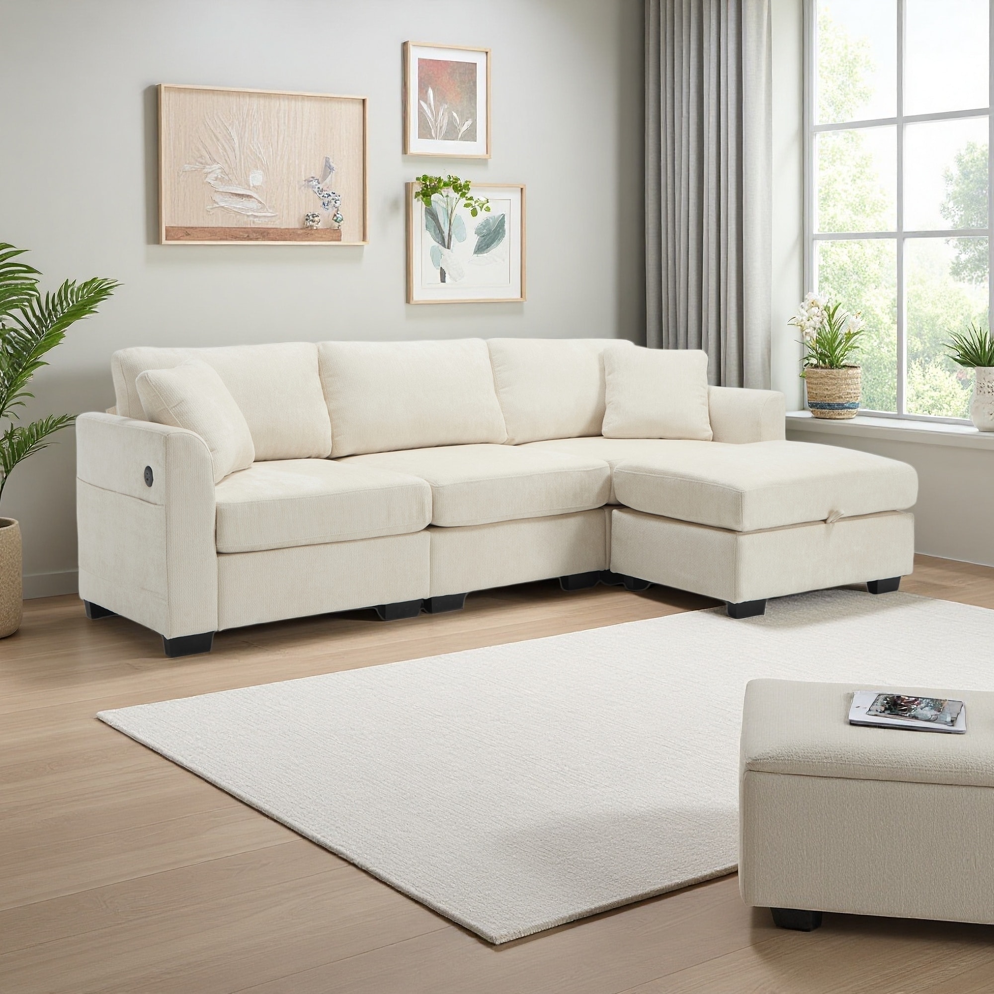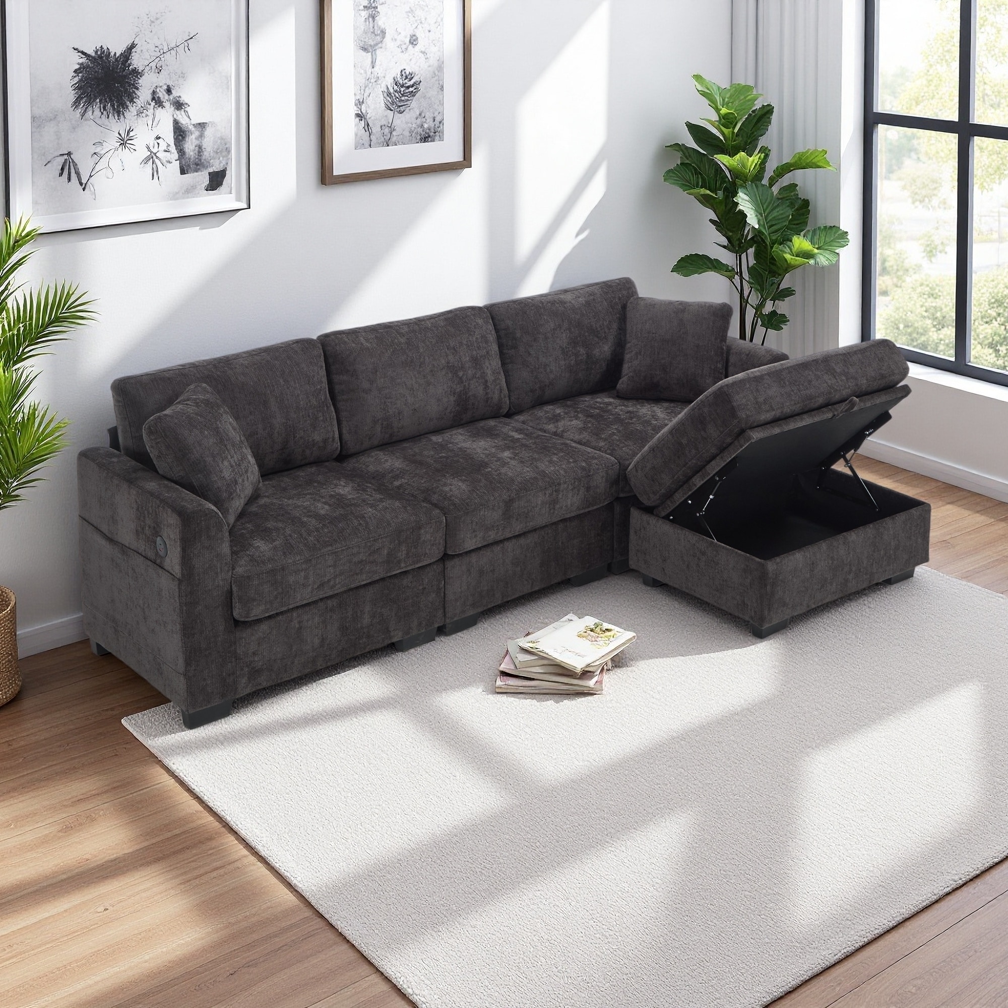 97'' Chenille L-Shaped Storage Sectional Sofa with Dual USB Ports, Ottoman and Side Pockets