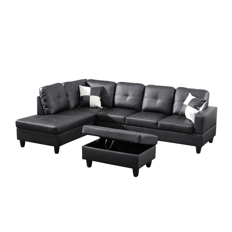 Modern Black L-Shaped Sectional Sofa with Chaise and Ottoman, PU Upholstered Couch with Ergonomic Backrest