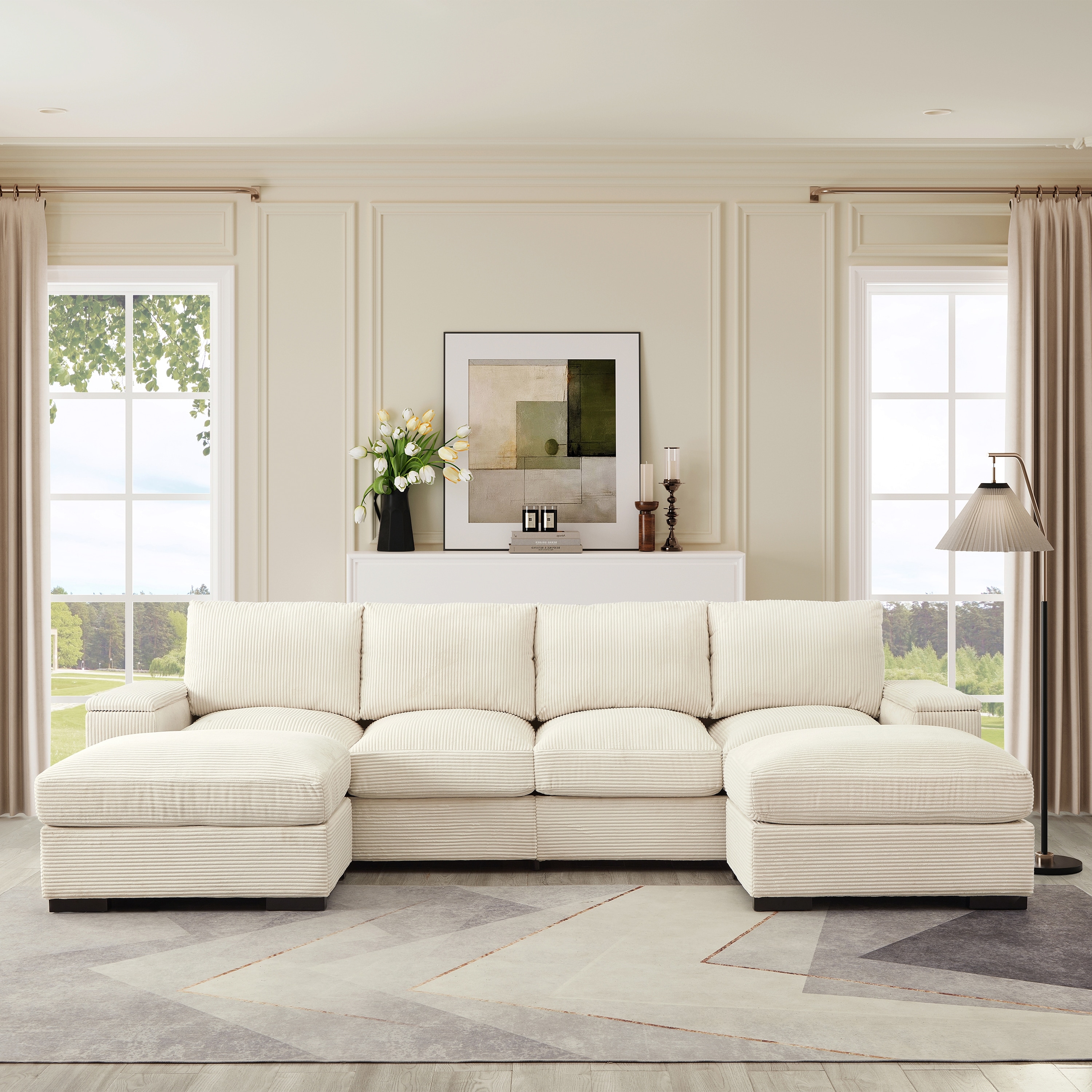 Deep Seat Sectional Sofa with 2 Ottomans, Corduroy 4 Seater U Shaped Sectional Sleeper Couches with Storage Armrests