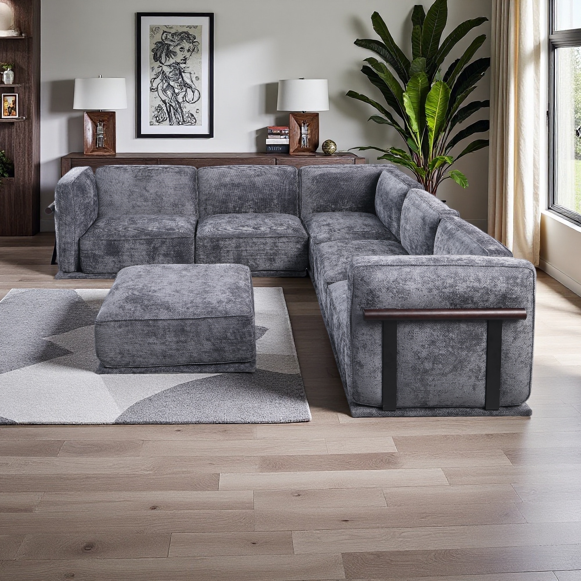 120'' Chenille Modular Sectional Sofa with Iron/Wood Frame and Ottoman (6-Seater)