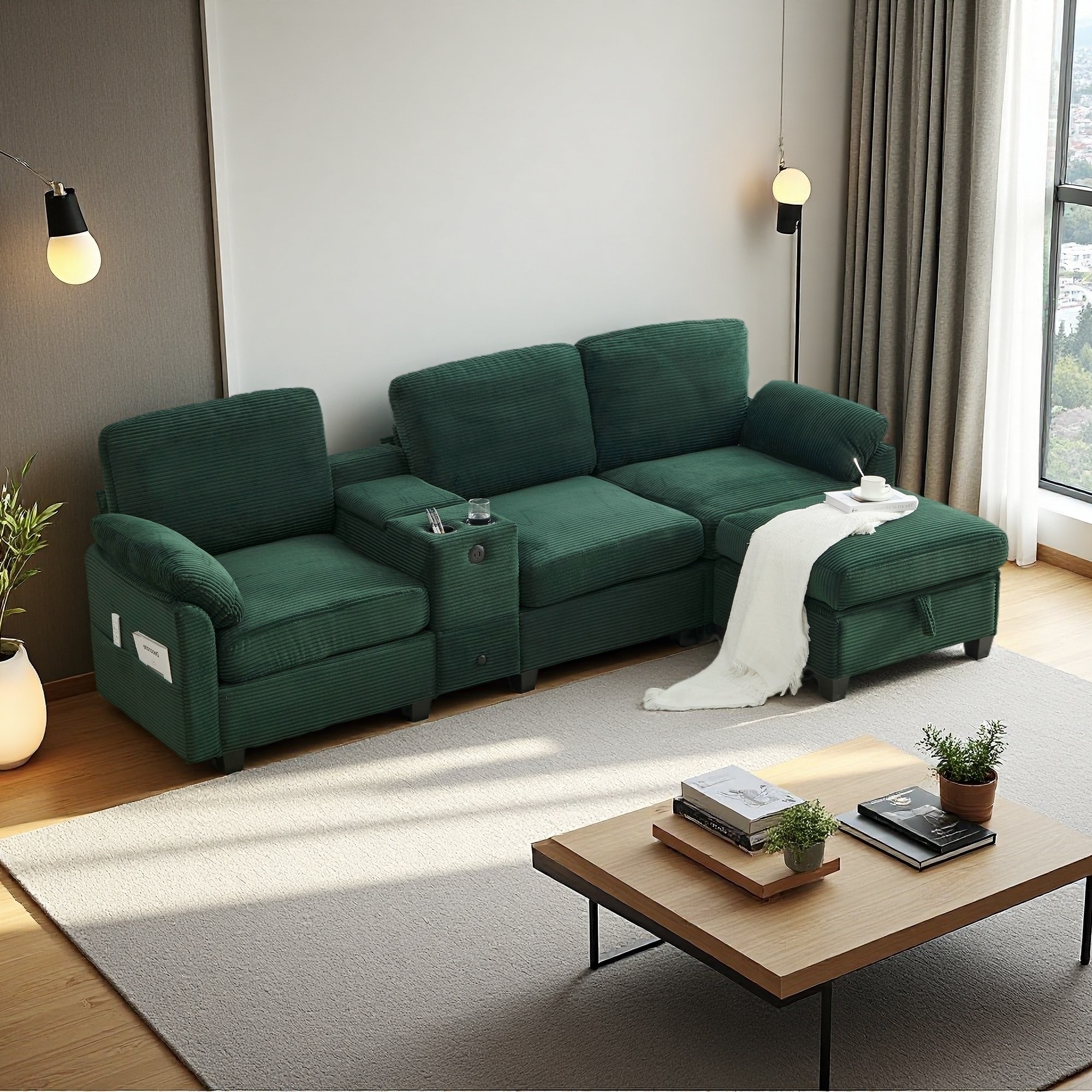 104.72" Corduroy L-Shaped 4-Seat Sectional Sofa with Cup Holders, USB Charging and Storage Ottoman