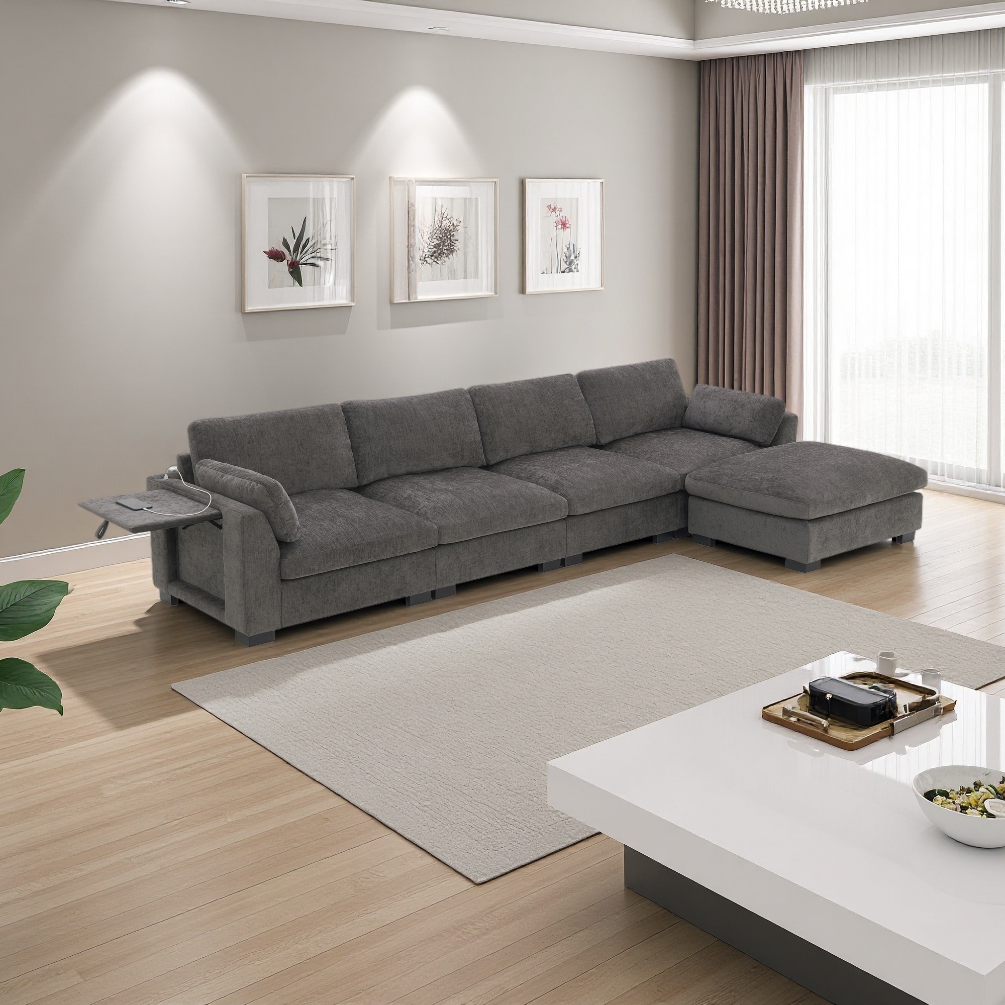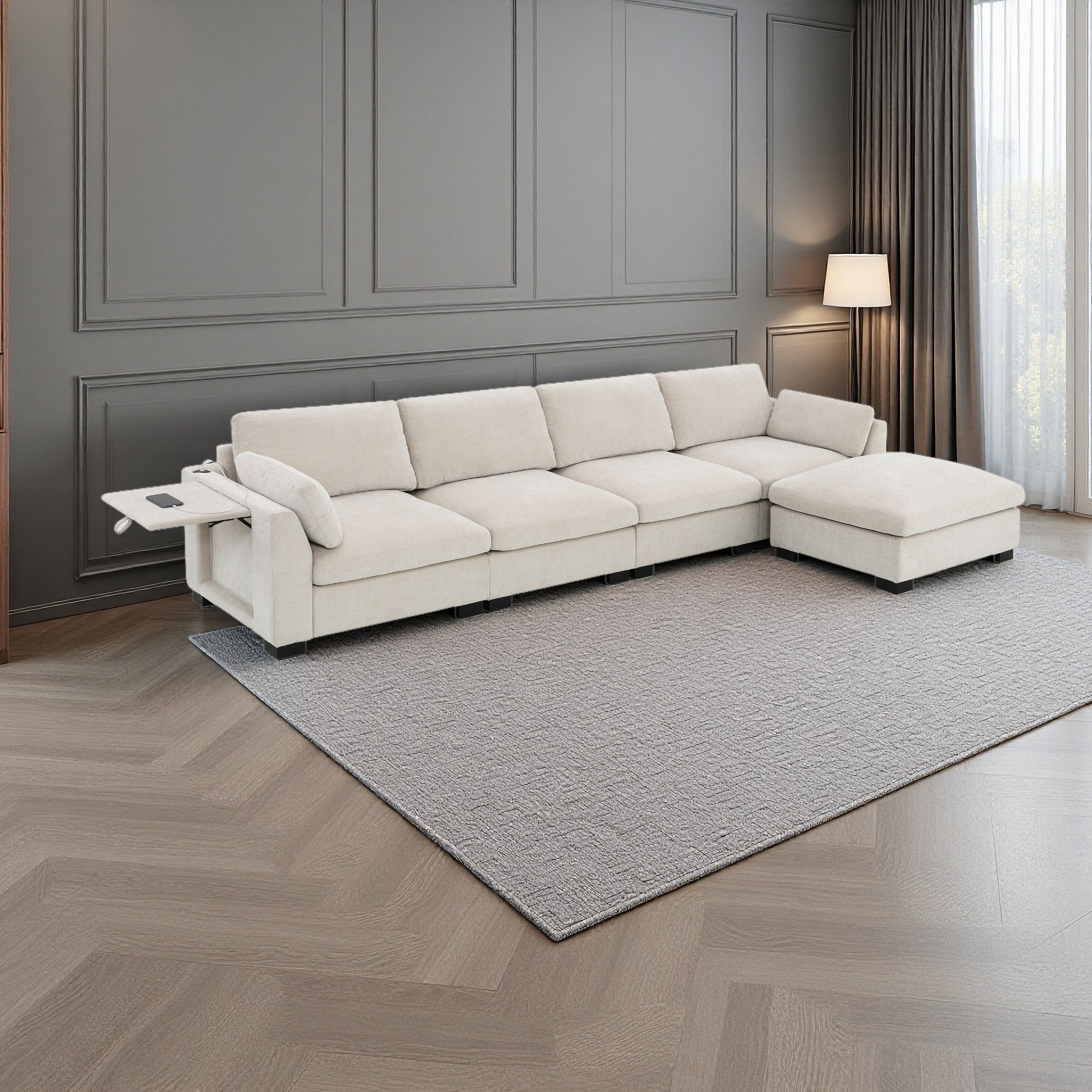130'' Chenille Modular L-Shaped Sectional Sofa with Folding Table, Dual-Port Charging, Storage Pockets, and Free Ottoman