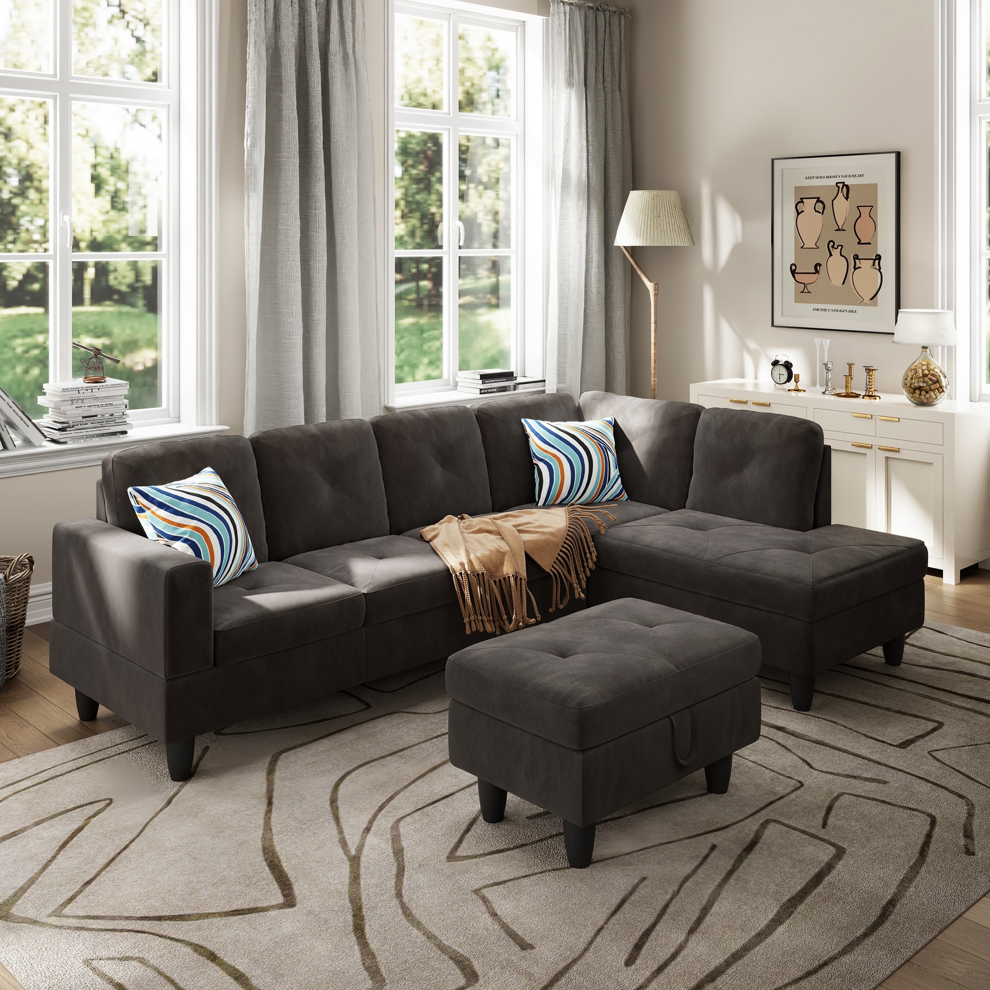 Grey Flannel 3-Piece Living Room Sofa Set L-Shaped Upholstered Sofa with Ottoman