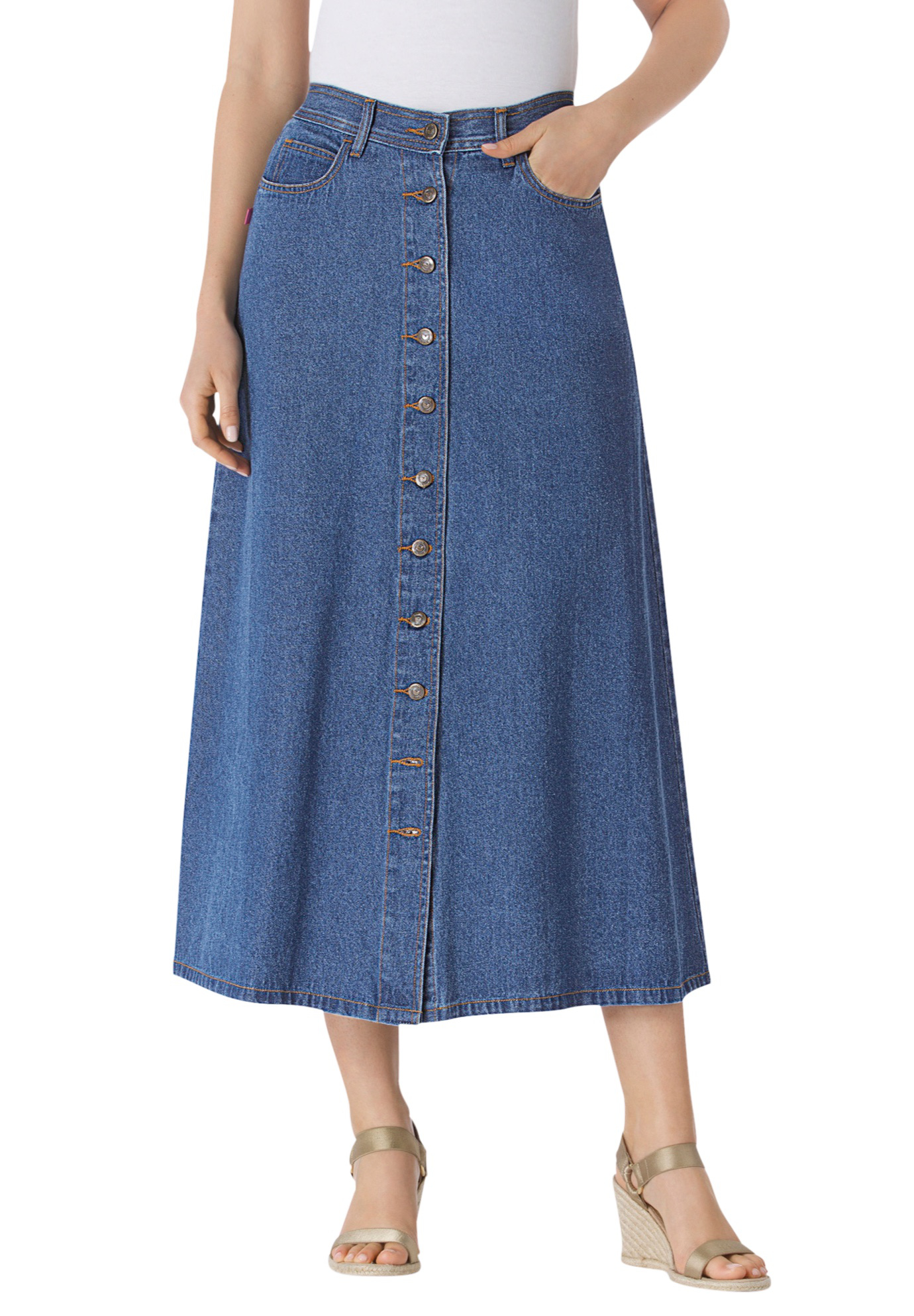 Plus Size Women's Perfect Side-Elastic All-Cotton Button Front Denim Jeans Skirt by Woman Within in Medium Stonewash (Size 24 WP)