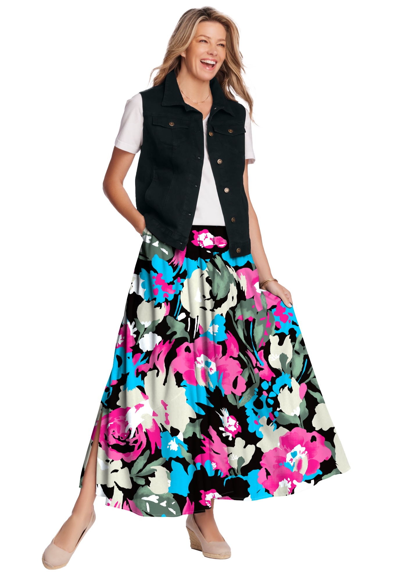 Plus Size Women's Pull-On Elastic Waist Soft Maxi Skirt by Woman Within in Black Happy Bloom (Size 22 W)