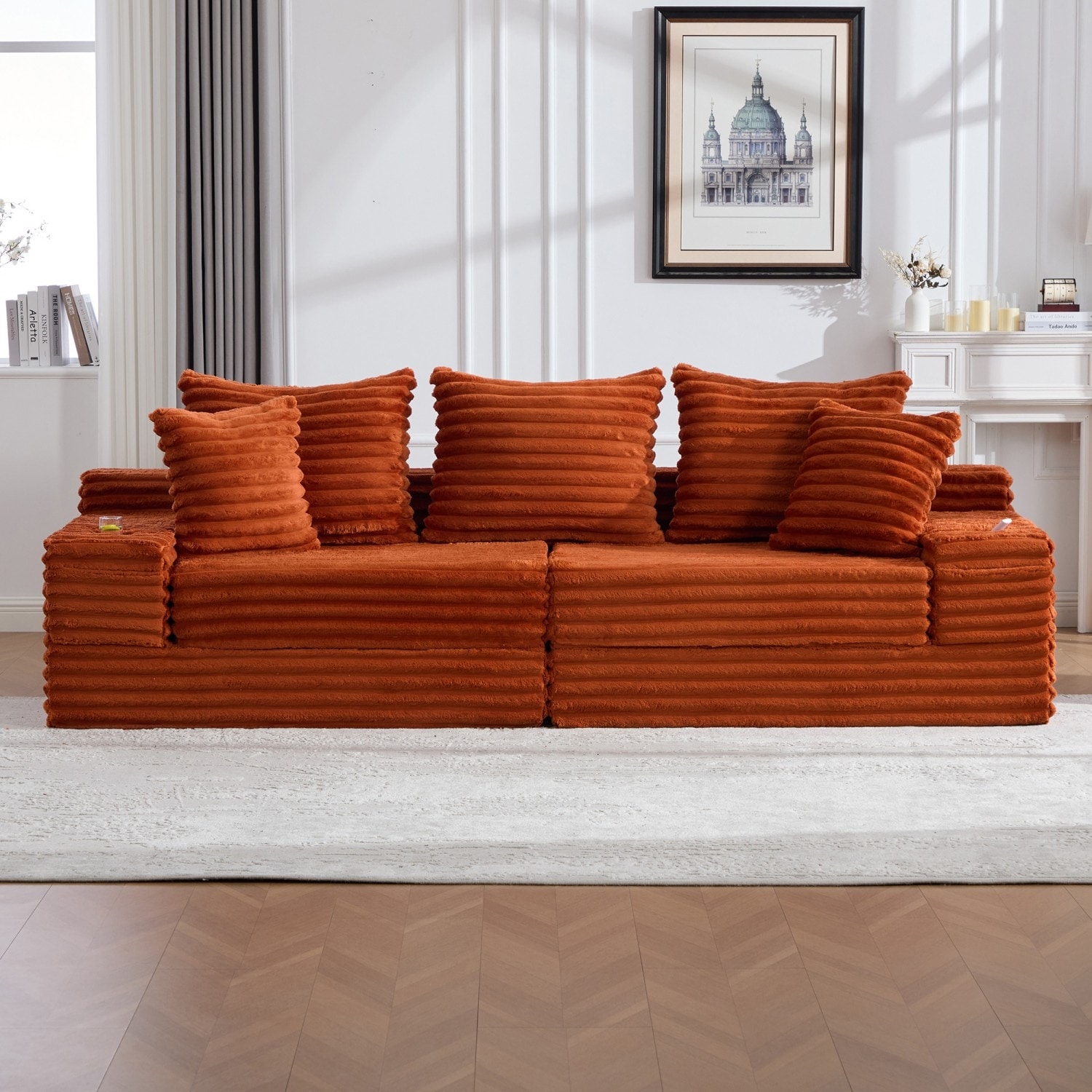 111" Corduroy L-Shape Sectional Sofa with Right Chaise, 8 Throw Pillows and Square Armrests