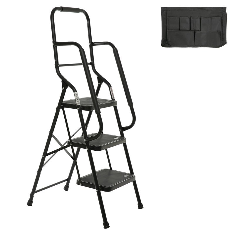 Folding 3-Step Ladder - 500Lb Capacity, Steel Frame with Handrails, Non-Slip Wide Pedal & Tool Bag, Black for Home Kitchen
