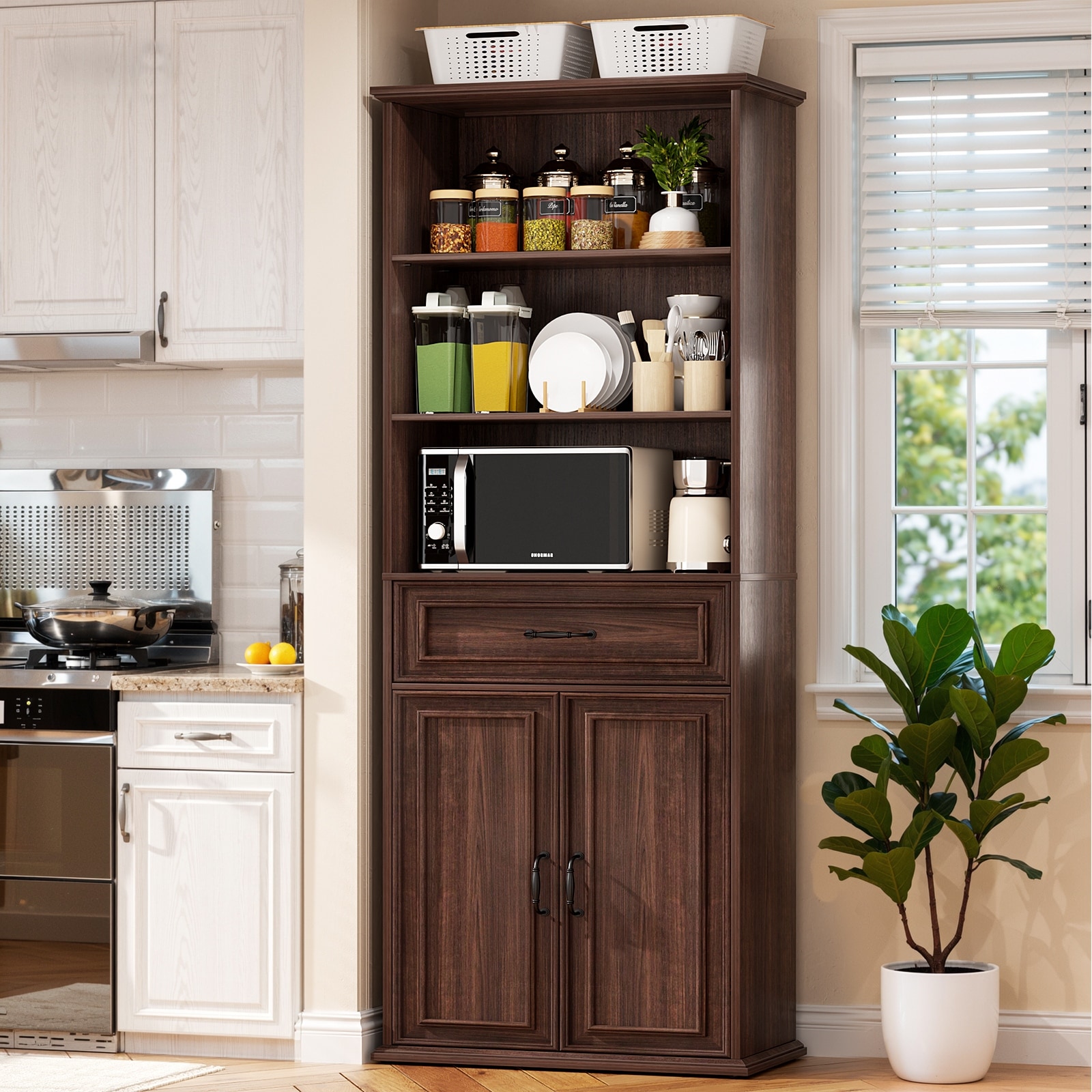 66.5" Kitchen Storage Cabinet with Hutch & Glass Doors