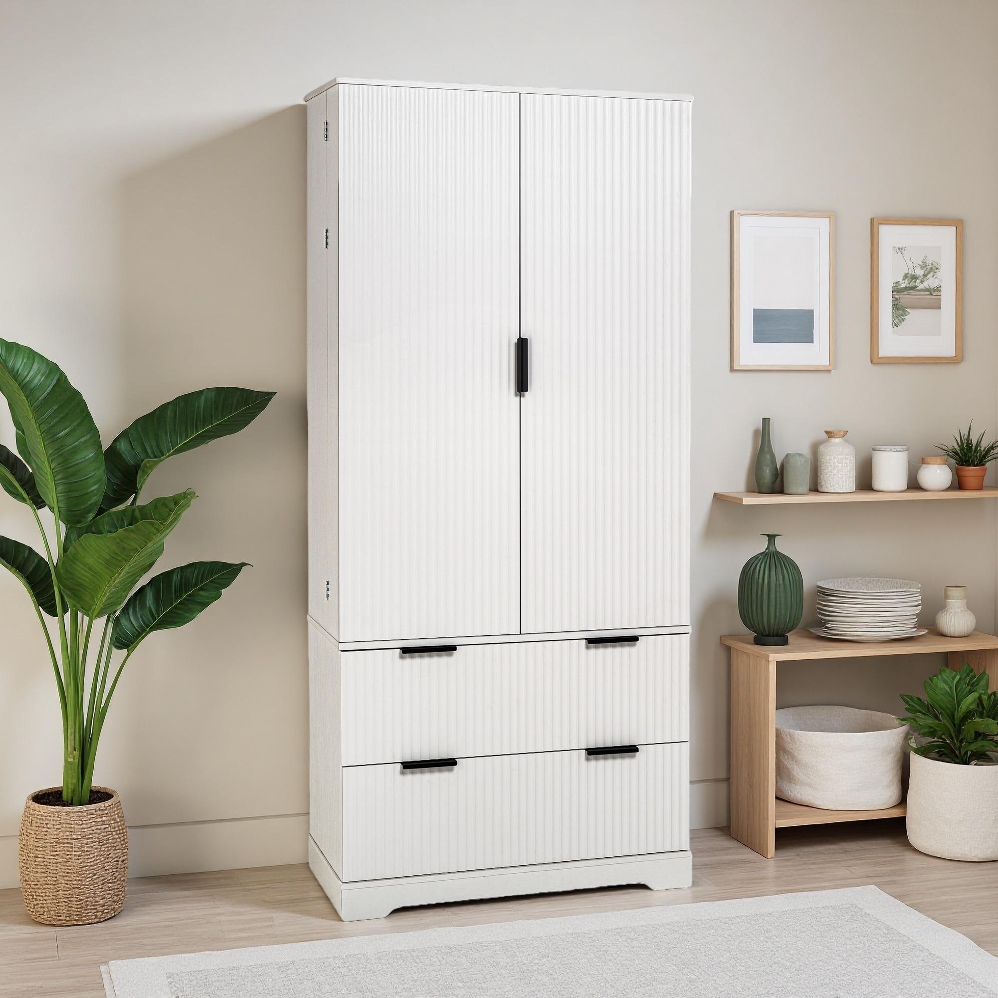 Set of 2 Closet System with Wooden Drawers and Hanging Rods, Closet Organizer with Adjustable Storage Shelves
