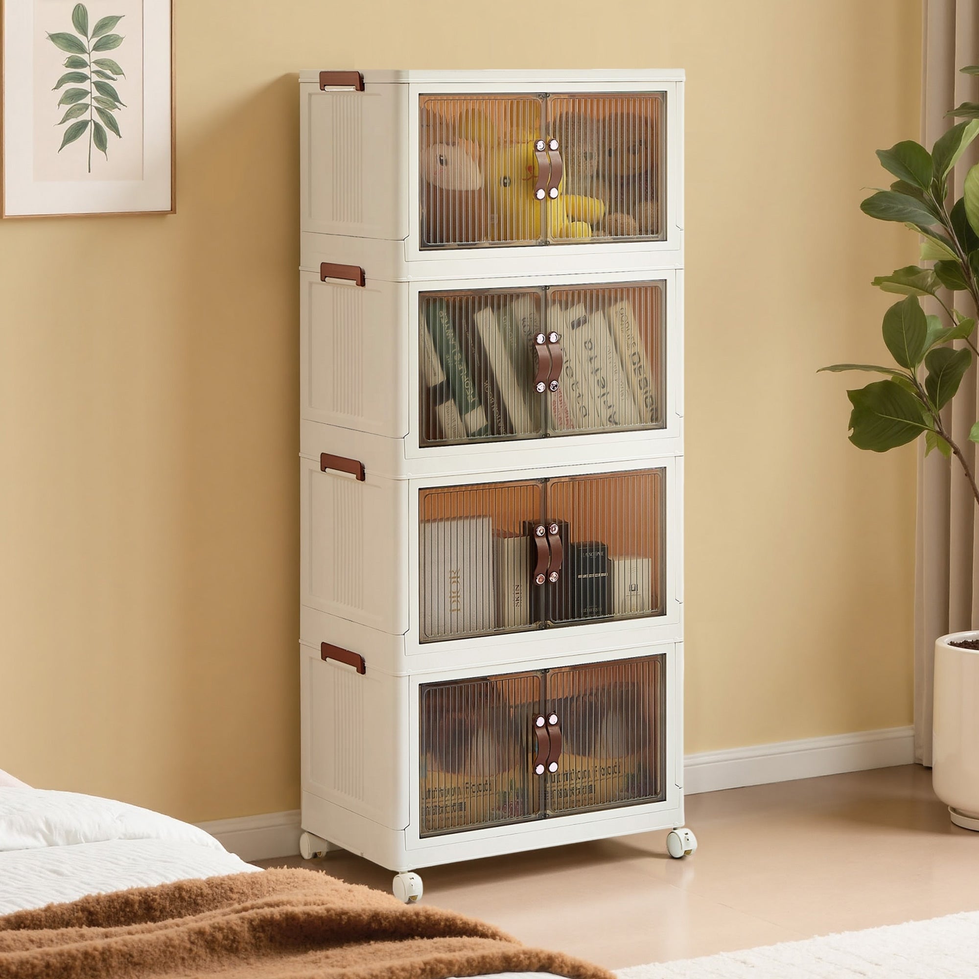 4/5-Tier Stackable PP Plastic Storage Bins with 4 Wheels & Magnetic Doors Multi-purpose Cabinet for Home Kitchen Bathroom