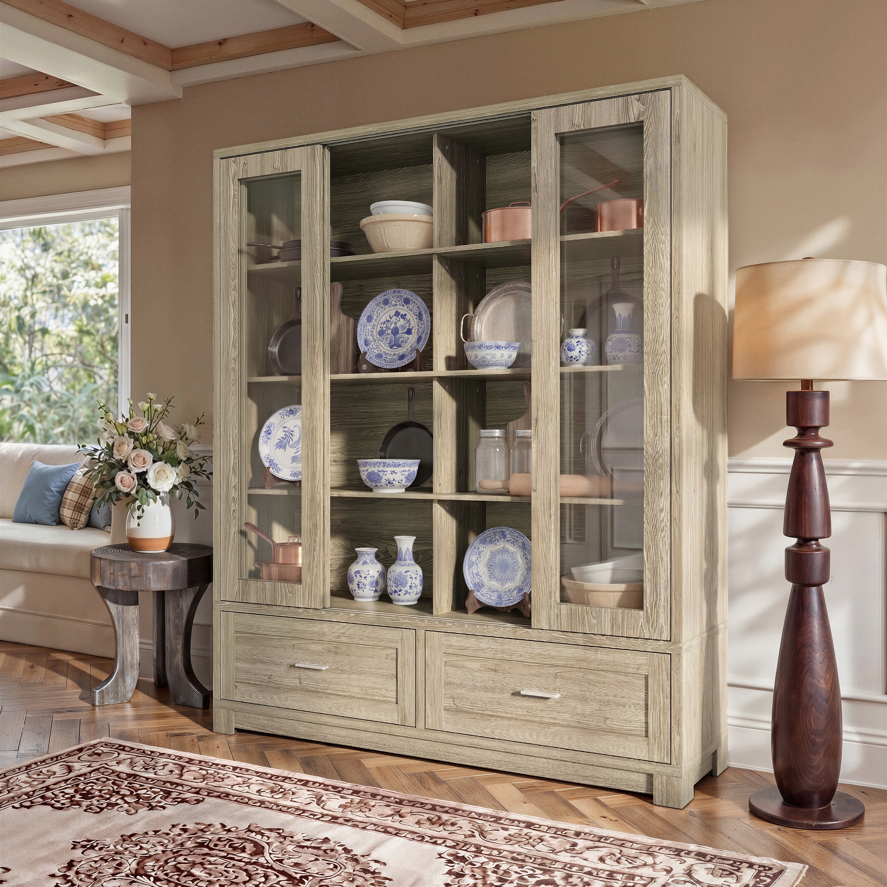 74" Tall Glass Door Storage Cabinet, China Hutch Pantry Buffet Cabinet for Living Room or Kitchen