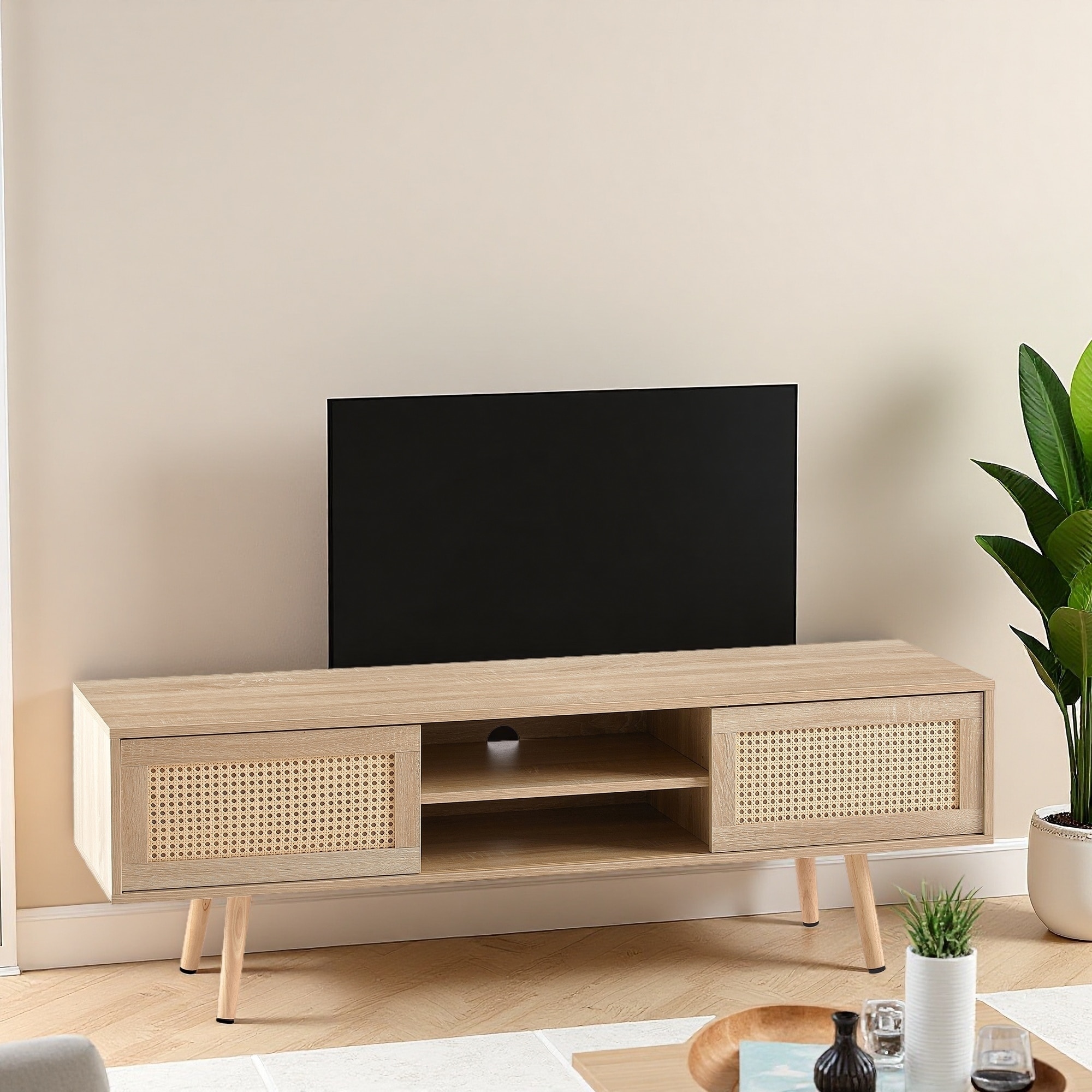 55.12" Rattan TV Cabinet with Double Sliding Doors & Adjustable Shelf
