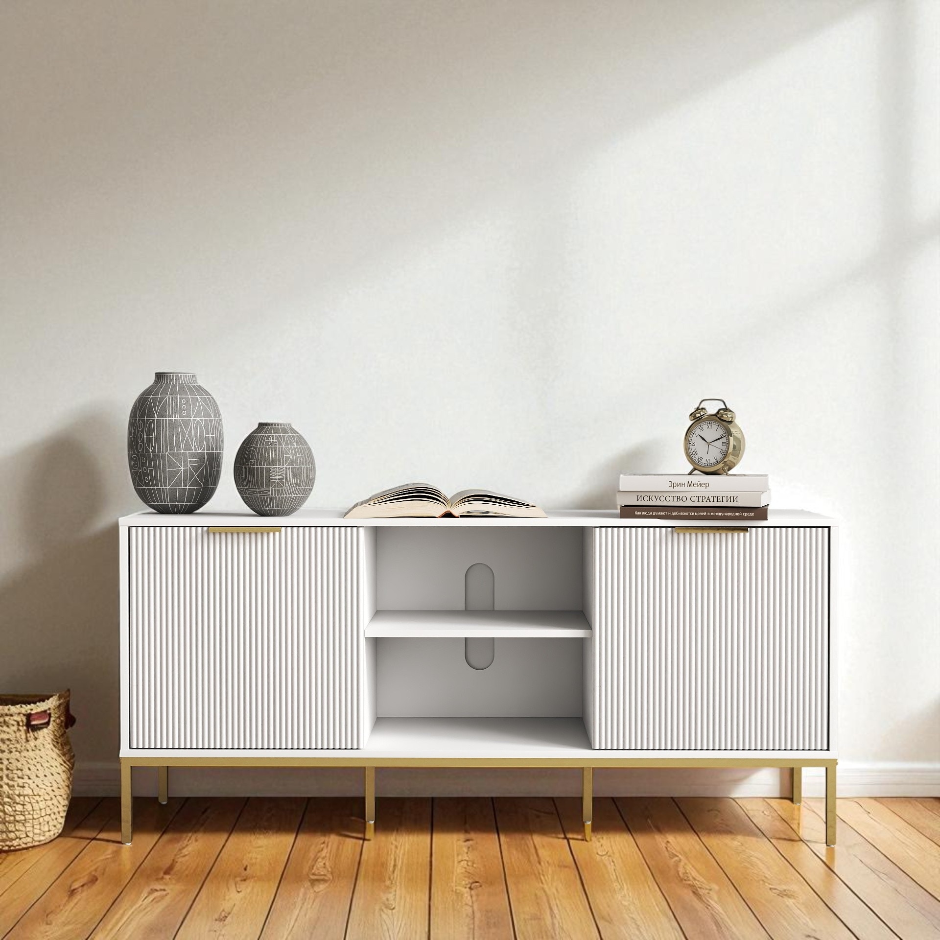 TV Stand with Wave-Design Doors, Open Shelf & Adjustable Storage, White Media Console with Gold Metal Legs for Living Room