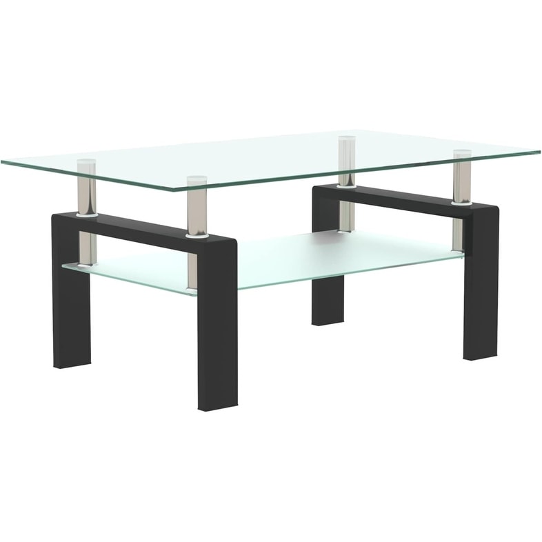 Rectangular Glass Coffee Table with Black Metal Legs, Clear Tempered Top, Modern Living Room Design